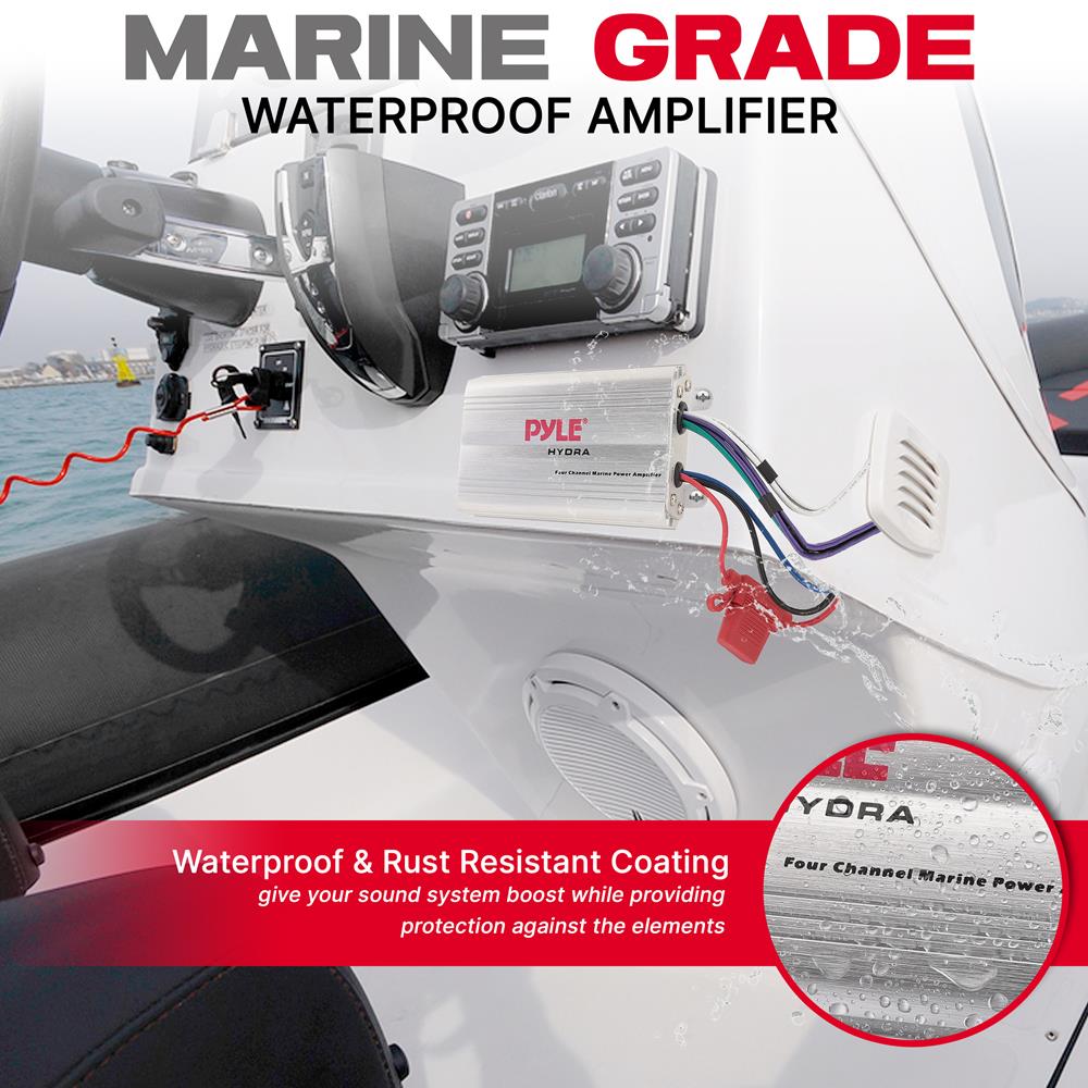 Cet amplificateur marin étanche MP3/iPod à 4 canaux est un ajout puissant à votre installation audio marine. Il délivre un maximum de 200 watts sur chacun des deux canaux pour une puissance impressionnante pratiquement inégalée. Il accepte les entrées de ligne RCA et comprend un adaptateur 3,5 mm vers RCA afin que vous puissiez facilement connecter votre lecteur MP3 ou iPod. Il accepte également les entrées haut et bas niveau standard d'une unité principale marine. Livré avec une télécommande filaire pour le réglage du volume. Pour plus de sécurité, cet amplificateur est équipé d'un circuit de protection d'alimentation et la mise en marche/arrêt progressive évite d'endommager votre équipement de haut-parleurs.