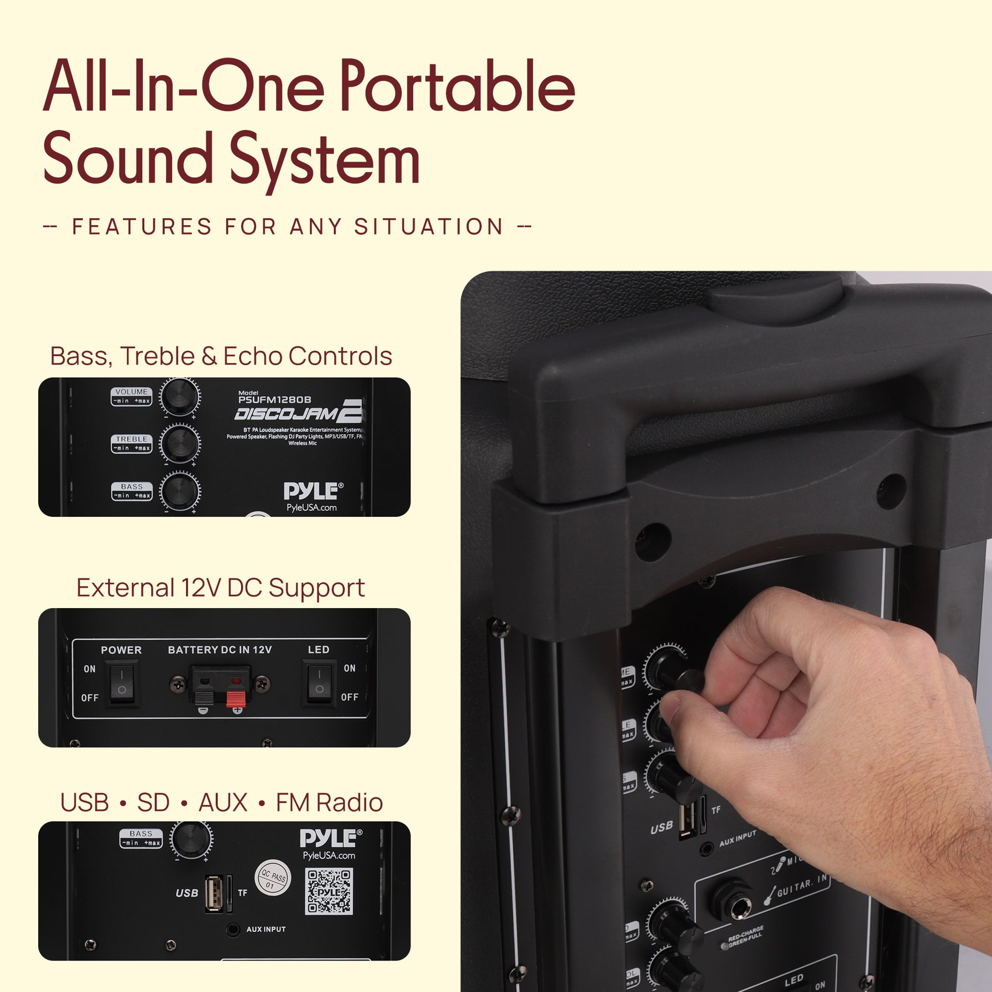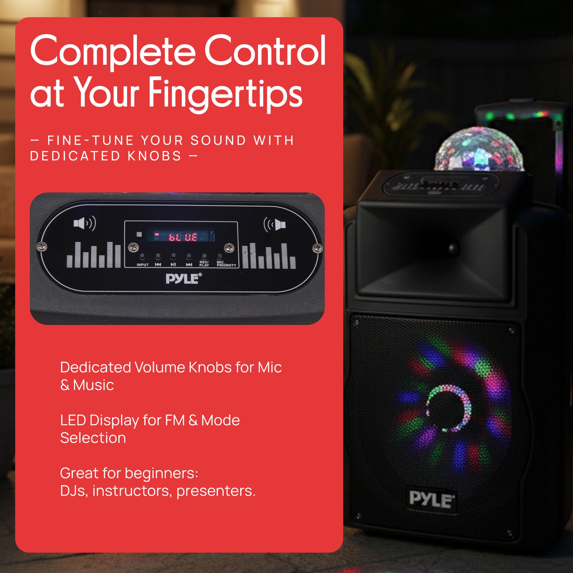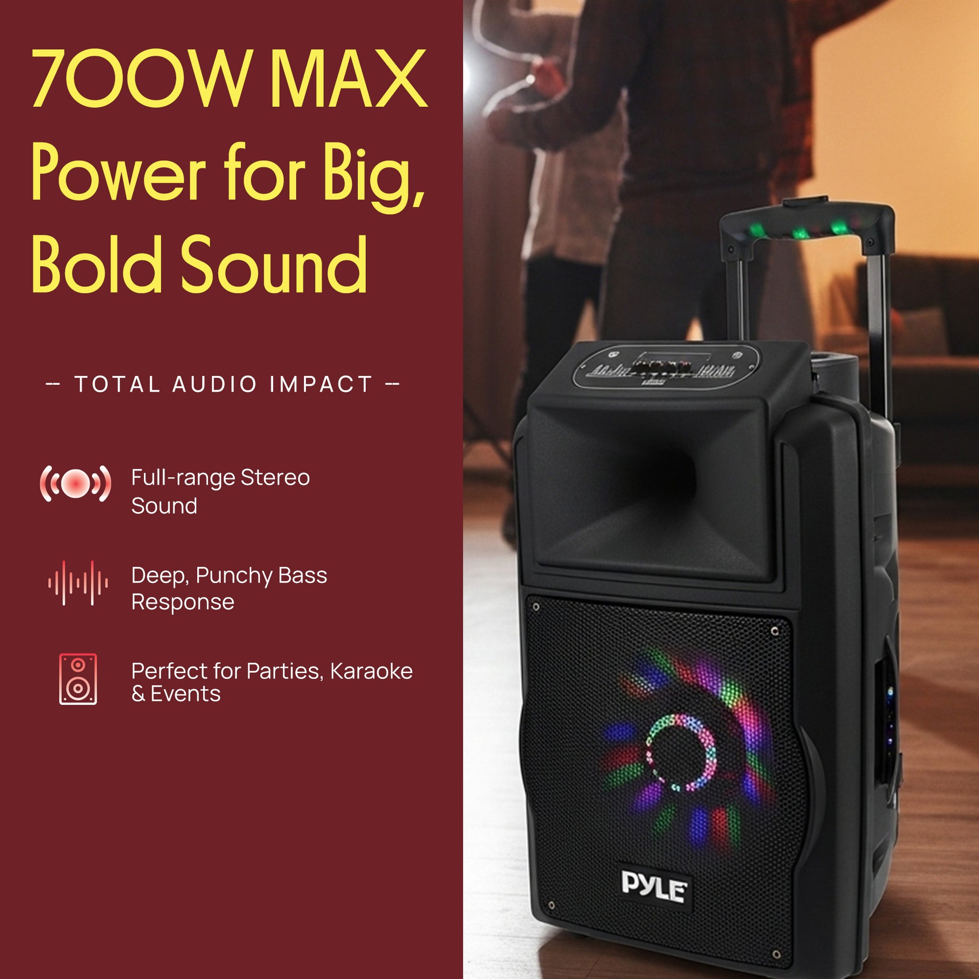 Les systèmes de haut-parleurs stéréo Pyle Disco Jam 2 ont été conçus pour faire monter l'ambiance de la fête. Jouez vos morceaux préférés aussi fort que vous le souhaitez et avec un style sans fil. La diffusion Bluetooth intégrée vous permet de jouer instantanément votre musique et fonctionne avec tous vos appareils préférés comme les smartphones, tablettes, ordinateurs portables et ordinateurs de bureau. Écoutez la radio FM ou diffusez de la musique via une clé USB, une carte mémoire SD ou une connexion via l'entrée Aux (3,5 mm). Les enceintes Disco Jam offrent une puissance impressionnante et des lumières DJ clignotantes qui donneront vie à toutes vos occasions. Utilisez-les à la maison, sur scène ou dans un auditorium. Elles sont parfaites pour toutes les réunions et vous feront vous sentir comme un véritable DJ dès que la musique commence. Le modèle PSUFM1280B offre une puissance de sortie de 700 watts, des subwoofers de 12 pouces, une réponse en fréquence de 120Hz-15KHz, des réglages d’aigus, de basses, d’écho, de volume et bien d’autres fonctionnalités pour faire vibrer le son et dynamiser la fête. Lancez la fête avec les systèmes de haut-parleurs Disco Jam !