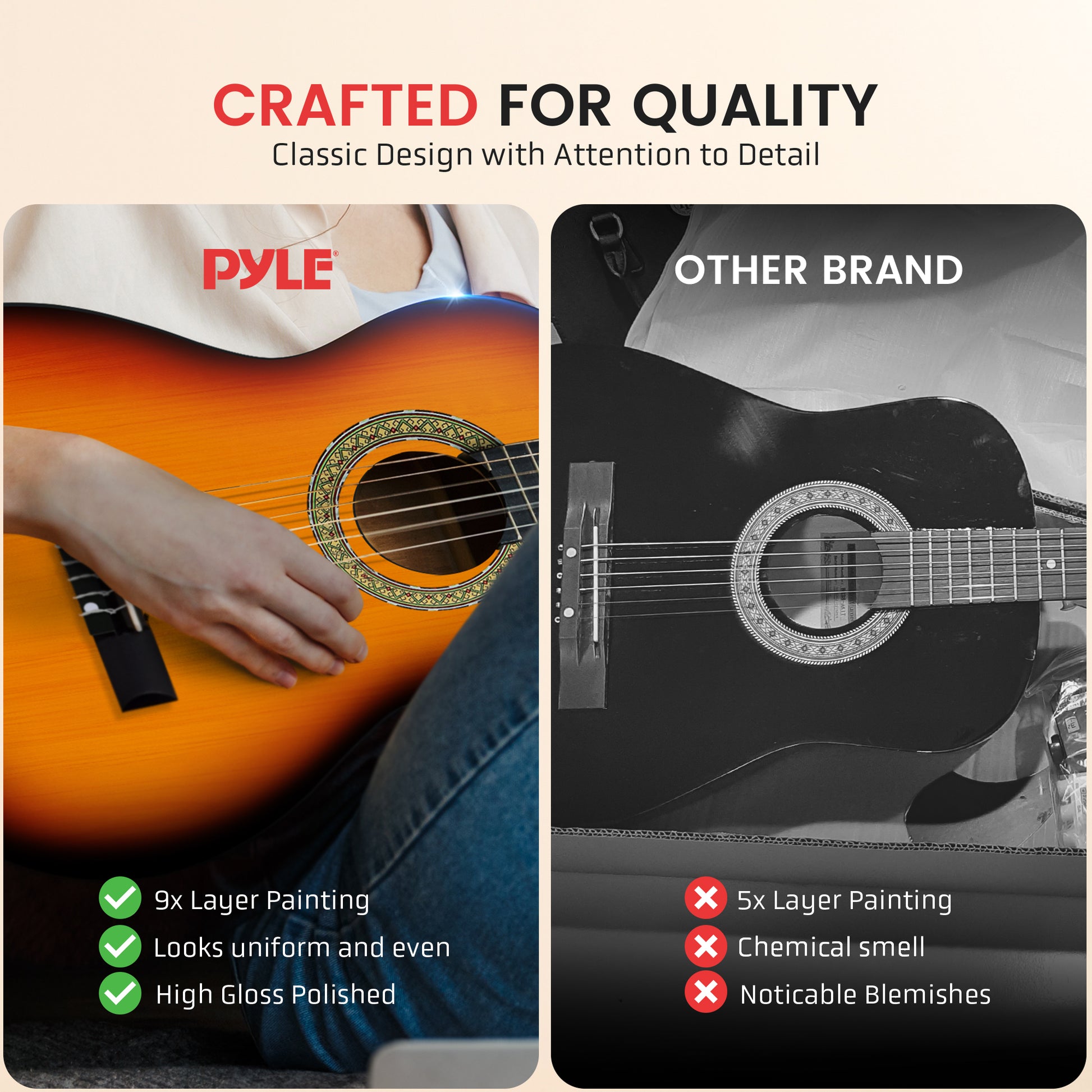 Contenu de la boîte : Guitare Médiators Accordeur de guitare numérique Cordes de guitare de rechange Housse de transport / rangement pour guitare Sangle d’épaule détachable pour guitare Chiffon de nettoyage "