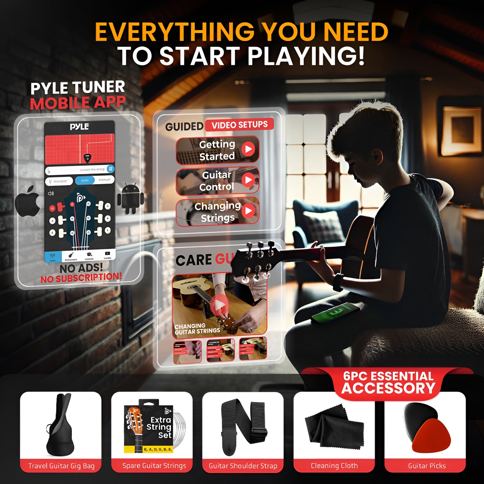 Contenu de la boîte : Guitare Médiators Accordeur numérique Jeu de cordes de rechange Housse de transport/rangement Bretelle d'épaule amovible Chiffon de nettoyage "