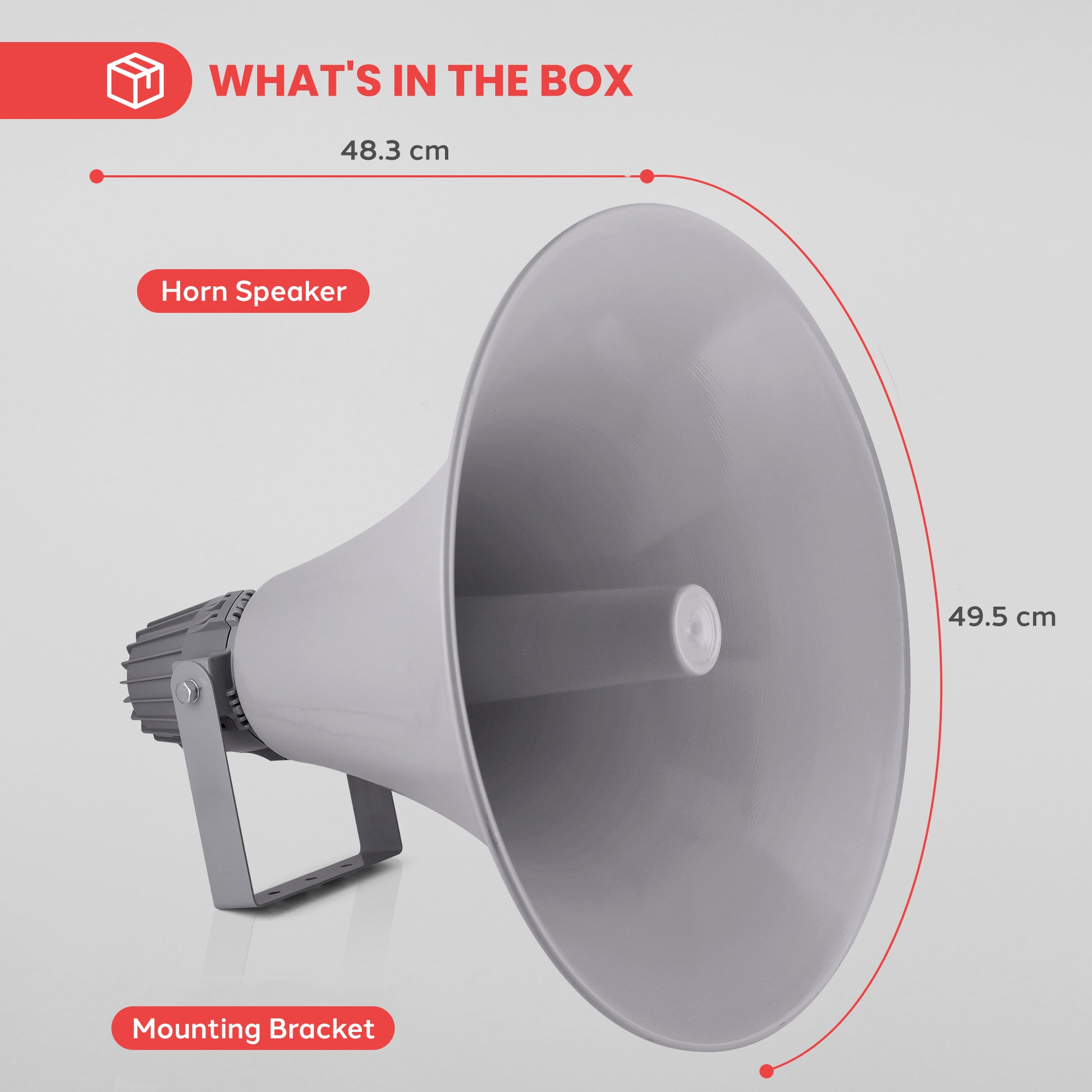 Ce haut-parleur corne de 19,5 pouces pour intérieur/extérieur est idéal pour votre système audio 70 V ou 100 V. Parfait pour les systèmes de sonorisation extérieurs lorsque vous avez besoin que votre son soit entendu de loin. Ce haut-parleur de 100 watts comprend des transformateurs 70 V et 100 V avec prises à 100, 50, 25 et 12,5 watts. Comprend un support de montage et la quincaillerie pour une installation facile. Faites entendre votre voix avec le PHSP20. Couleur : gris.