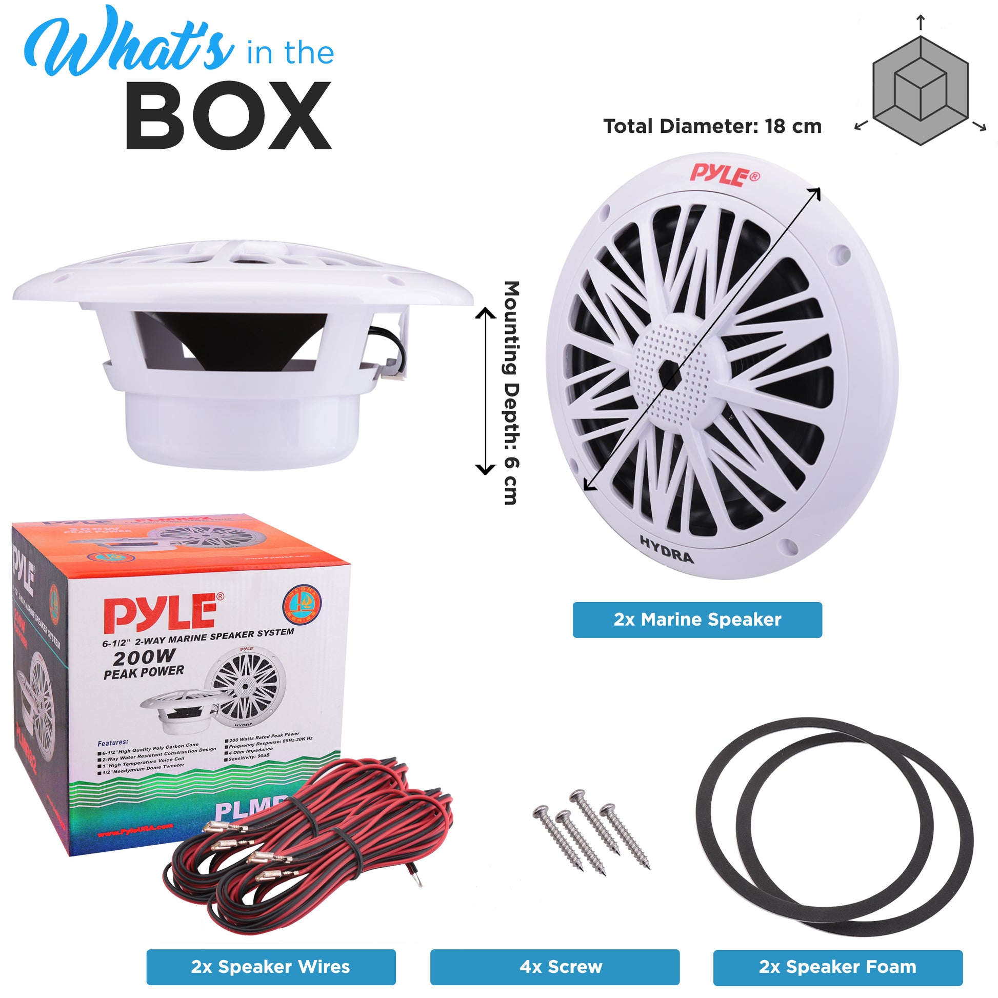 Les enceintes de la série Hydra de Pyle sont résistantes à l'eau et conçues pour être utilisées sur votre bateau, sur le quai, au bord de la piscine ou simplement montées à l'extérieur. Elles sont dotées de grilles en treillis inoxydable pour une protection de qualité. Le modèle PLMR62 est une enceinte marine bidirectionnelle de 200 watts et 16,5 cm (6,5 pouces) à gamme complète. Ces enceintes blanches sont équipées d'un tweeter à dôme en néodyme de 0,5 pouce pour des aigus riches et d'une bobine acoustique en aluminium de 1 pouce pour une reproduction sonore précise. Le panier moulé en plastique ABS garantit un son sans distorsion.