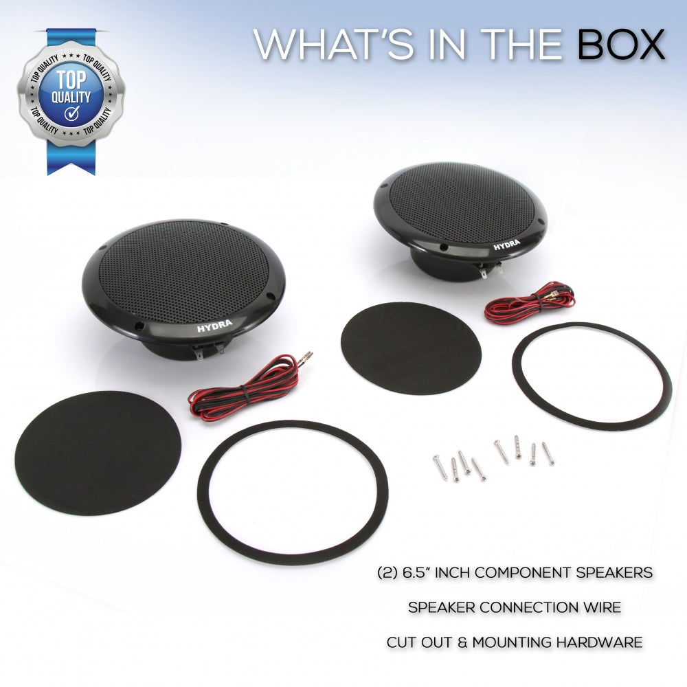 Les enceintes de la série Hydra de Pyle sont résistantes à l'eau et conçues pour être utilisées sur votre bateau, sur le quai, au bord de la piscine ou simplement montées à l'extérieur. Elles sont dotées de grilles en treillis inoxydables pour une protection de qualité. Les PLMR605B sont des enceintes deux voies de 16,5 cm (6,5 pouces) à gamme complète de 400 watts, adaptées à un usage marin. Ces enceintes noires sont équipées d'un tweeter à dôme en néodyme de 0,5 pouce pour des aigus riches et d'une bobine mobile en aluminium de 1 pouce pour une reproduction sonore précise. Le paquet comprend une paire d'enceintes, le matériel d'installation et les grilles.