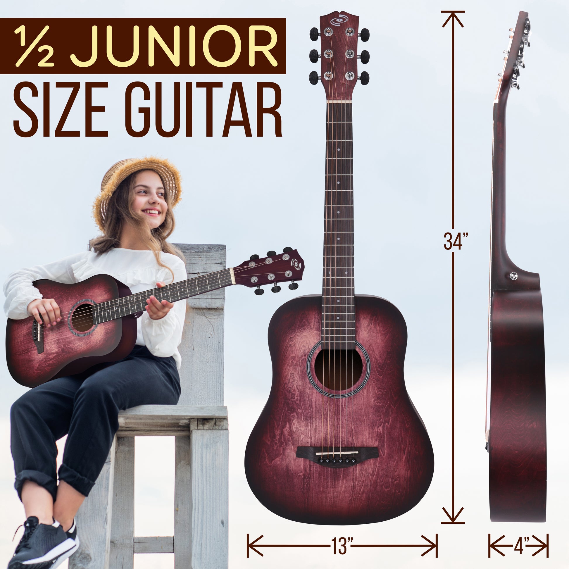 - Longueur totale de la guitare : 34 pouces
