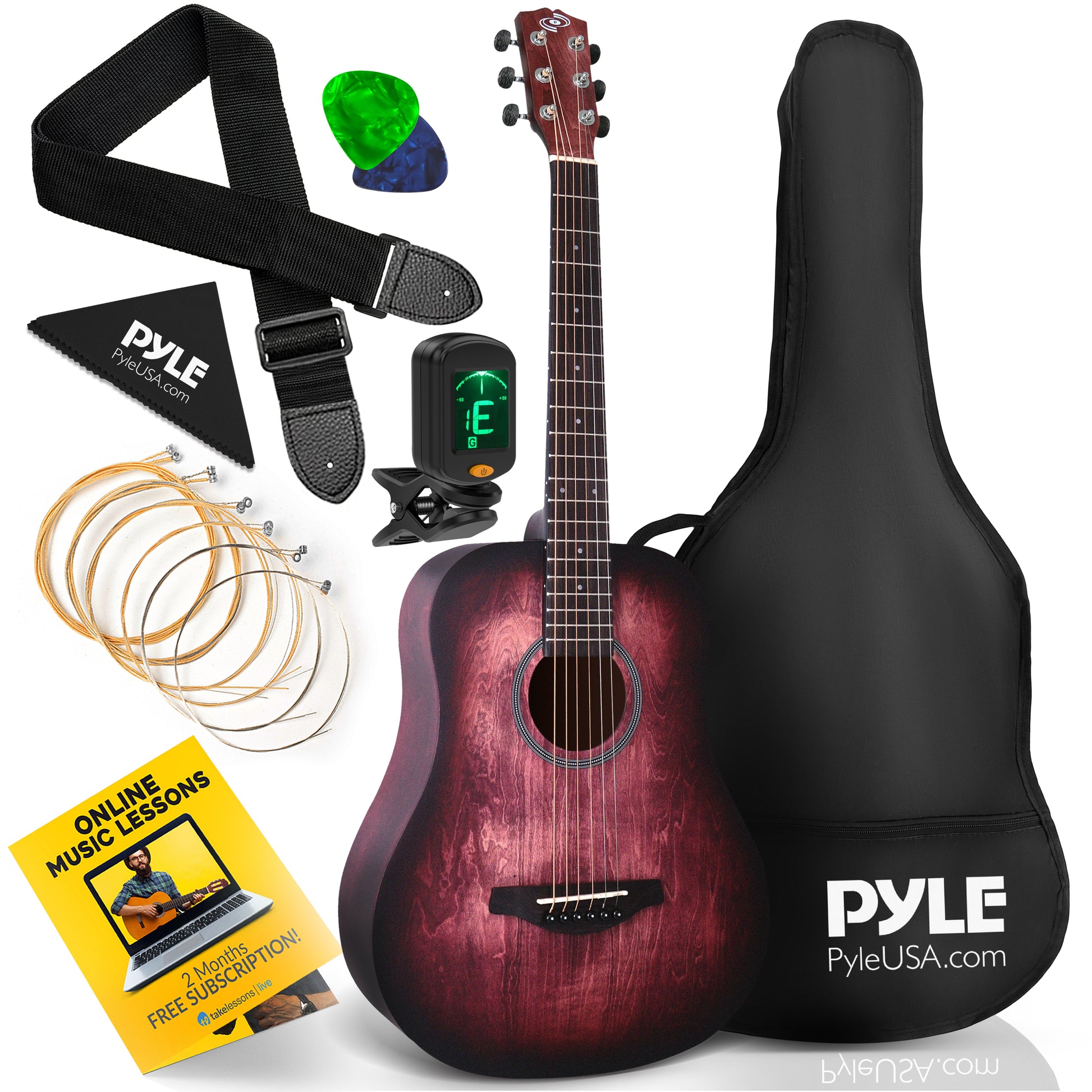 Contenu de la boîte : Guitare acoustique 6 cordes Housse de transport / rangement (6) cordes de guitare de rechange Bretelle d’épaule détachable Accordeur à anche Chiffon de nettoyage (2) médiators en nacre "