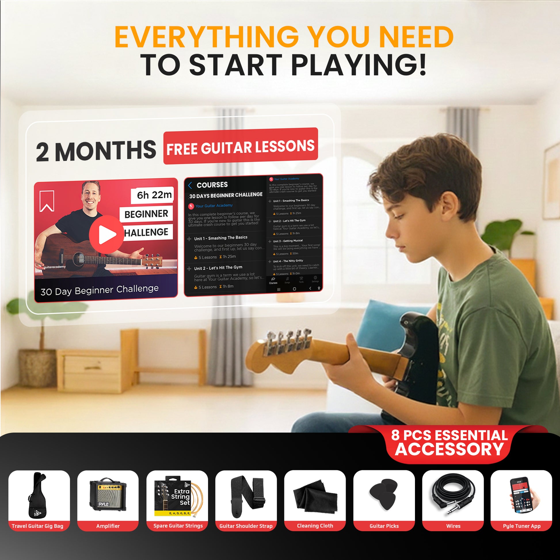Contenu de la boîte : Guitare électrique 6 cordes Amplificateur 10w Câble de guitare 98,4’’ - pouces Clé Allen et tige de vibrato Housse de transport (6) cordes de guitare électrique de rechange + 1ère corde supplémentaire Sangle d’épaule détachable Accordeur numérique (3) médiators nacrés