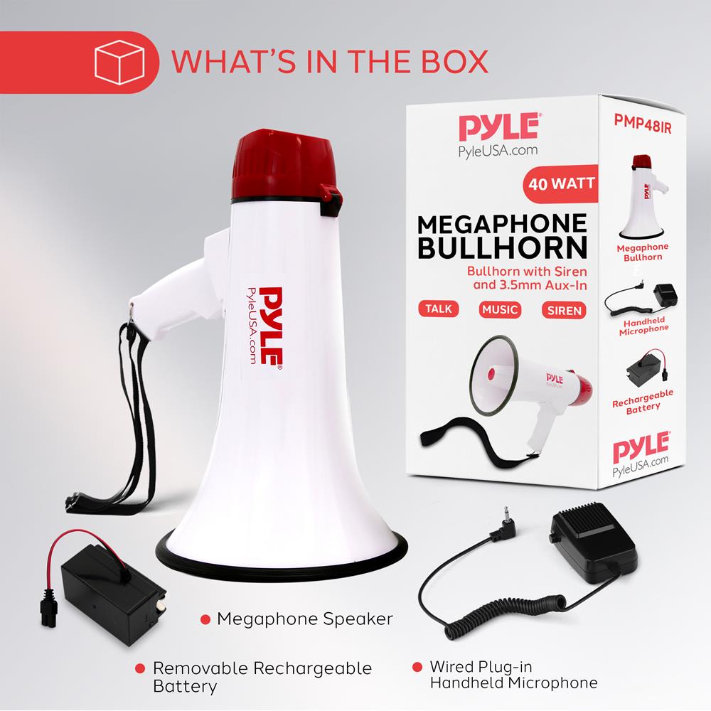 Le PMP48IR fait partie de la dernière gamme de mégaphones proposée par Pyle. À chaque nouvelle version de nos mégaphones phares, nous avons amélioré l'autonomie de la batterie, la puissance et l'ergonomie. La batterie lithium incluse offre une alimentation durable et permet d'économiser sur l'achat de piles. Branchez votre lecteur MP3 et diffusez votre audio ou votre musique numérique pour que tout le monde puisse l'entendre. Ce modèle dispose de 40 watts de puissance, de sorte que votre voix sera entendue à 1000 yards. Le PMP48IR est équipé d'une mémoire de 10 secondes — parfait si vous devez diffuser le même message à plusieurs reprises. Et si vous avez simplement besoin d'attirer l'attention de tous, passez en mode sirène pour activer une alarme puissante et bruyante. Fonctionne parfaitement à l'intérieur comme à l'extérieur.