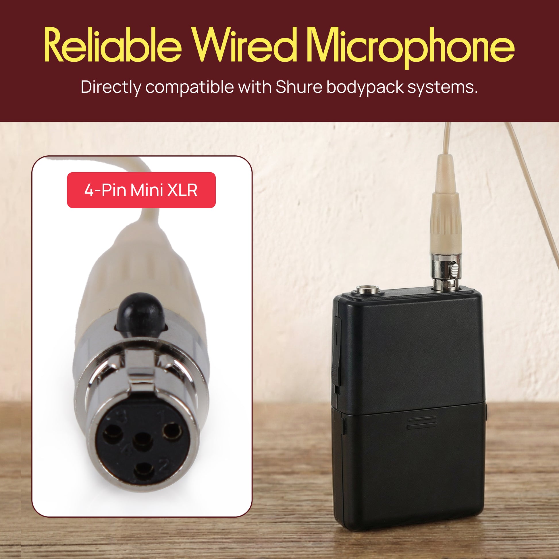 Ce micro omnidirectionnel à porter sur la tête possède un condensateur à électret arrière pour un enregistrement cristallin de votre voix. Il utilise un connecteur mini XLR 4 broches, ce qui le rend parfaitement compatible avec votre système Shure. Pare-vent inclus.