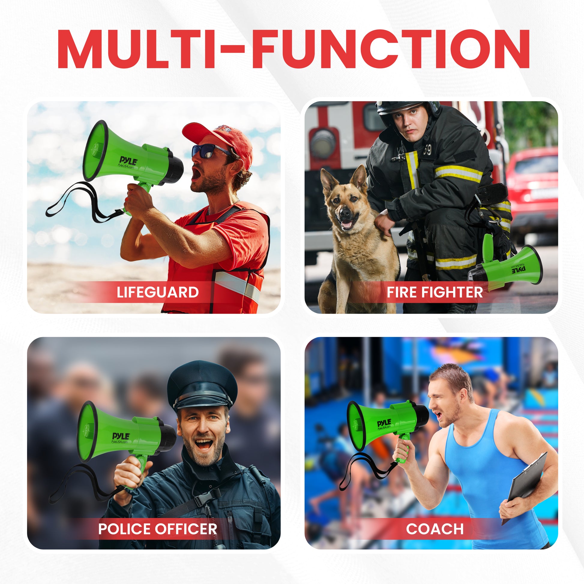 - Taille du mégaphone (diamètre x longueur) : 6,3’’ x 10,0’’ pouces