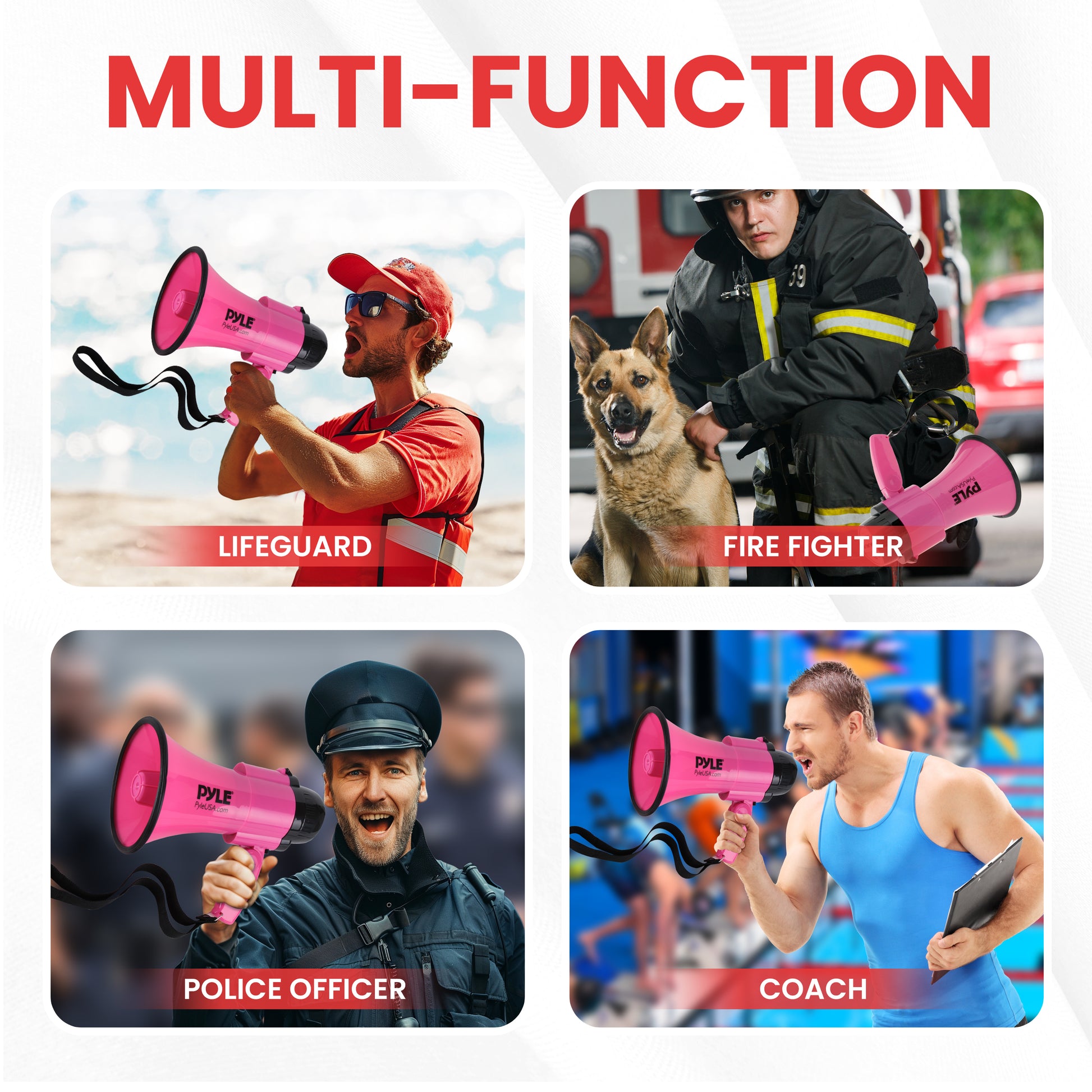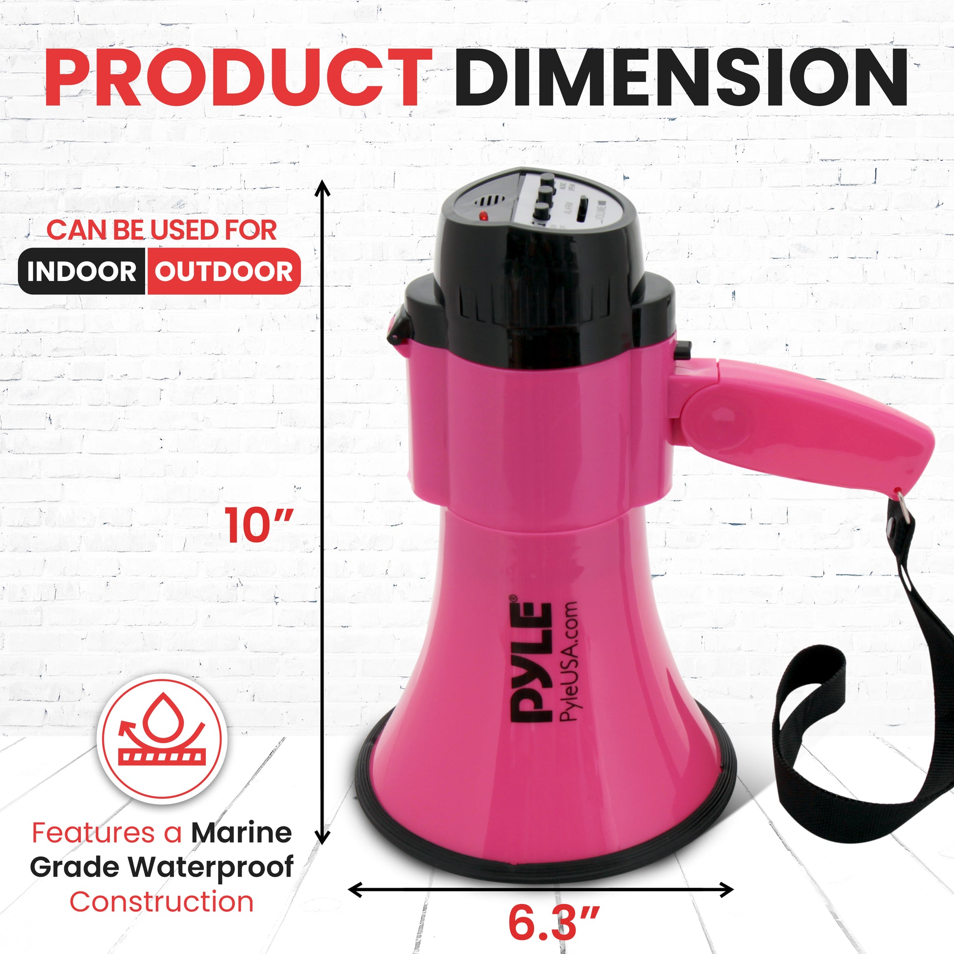 - Taille du mégaphone (diamètre x longueur) : 6,3’’ x 10,0’’ pouces