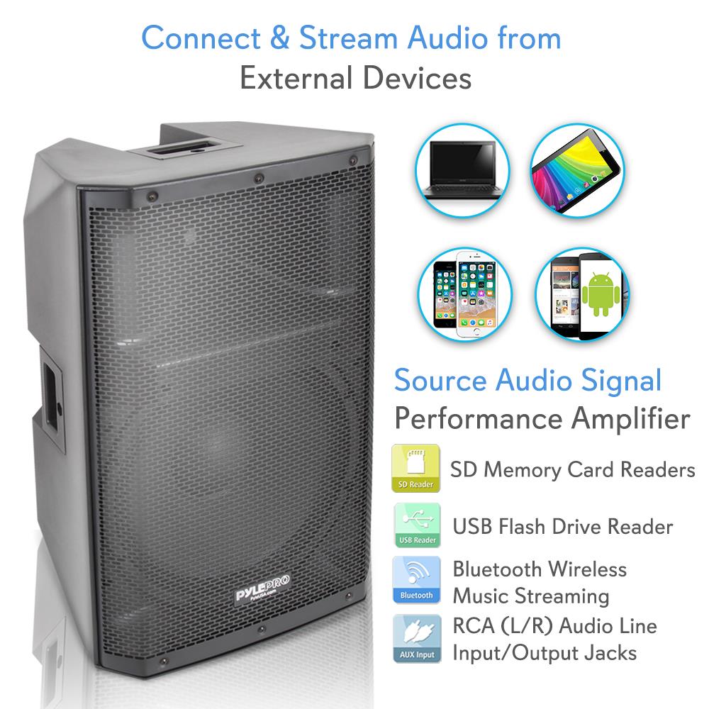 Le haut-parleur de scène et de studio Pyle 15'' - Système de haut-parleur amplifié Bluetooth PA avec lecture MP3/USB/SD (1400 watts) - Enceinte PA à boîtier moulé - Sortie audio haute puissance - Système sonore : haut-parleurs 15'', tweeter 1,75'' - Capacité de diffusion musicale sans fil Bluetooth - Haut-parleur actif 2 voies, pleine gamme - Prise en charge des fichiers audio numériques MP3 - Lecteurs de carte mémoire USB Flash & SD - Affichage des informations ID3 Tag, titre de la chanson, artiste - (2) connecteurs XLR 3 broches - Entrée ligne 1/4'' connecteur 6,35 mm - (2) 1/4'' 3,5 mm Microphone/Guitare/AUX - Contrôle indépendant du volume et des effets par canal - Égaliseur graphique 5 bandes - Contrôle des effets d'écho numérique - Prises RCA (L/R) entrée/sortie audio.