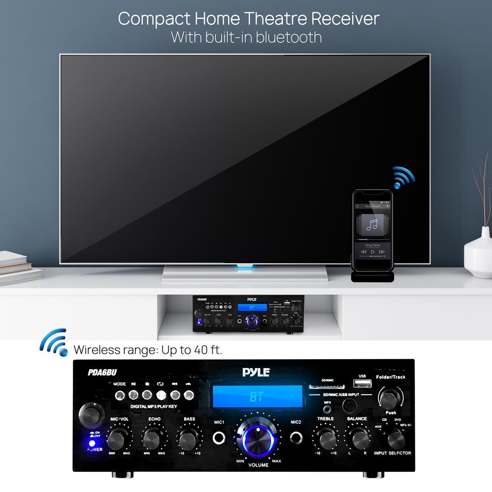 Le récepteur amplificateur stéréo Bluetooth est la solution parfaite pour tous vos besoins audio ! Ajoutez une performance sonore puissante de qualité home cinéma à votre bureau grâce à un amplificateur compact. Profitez d’un son clair et précis, doté de nombreuses fonctionnalités de lecture, notamment le streaming audio sans fil Bluetooth, la radio FM, des lecteurs de clé USB et de carte mémoire SD, la prise en charge des fichiers audio numériques MP3, ainsi qu’une entrée Aux (3,5 mm) pour connecter et diffuser directement le son depuis des appareils externes. L’interface de connexion du panneau arrière comprend deux prises microphone 1/4’’, des connecteurs RCA (G/D), des fiches banane, et l’entrée USB fait également office de port de charge pour appareil. Bénéficiez d’un contrôle audio pratique grâce au centre de commande par boutons sur le panneau avant, tandis que l’écran LCD numérique affiche les tags ID3 pour afficher commodément les titres des morceaux. Profitez d’une performance sonore polyvalente et puissante avec le système amplificateur stéréo compact Home Theater.