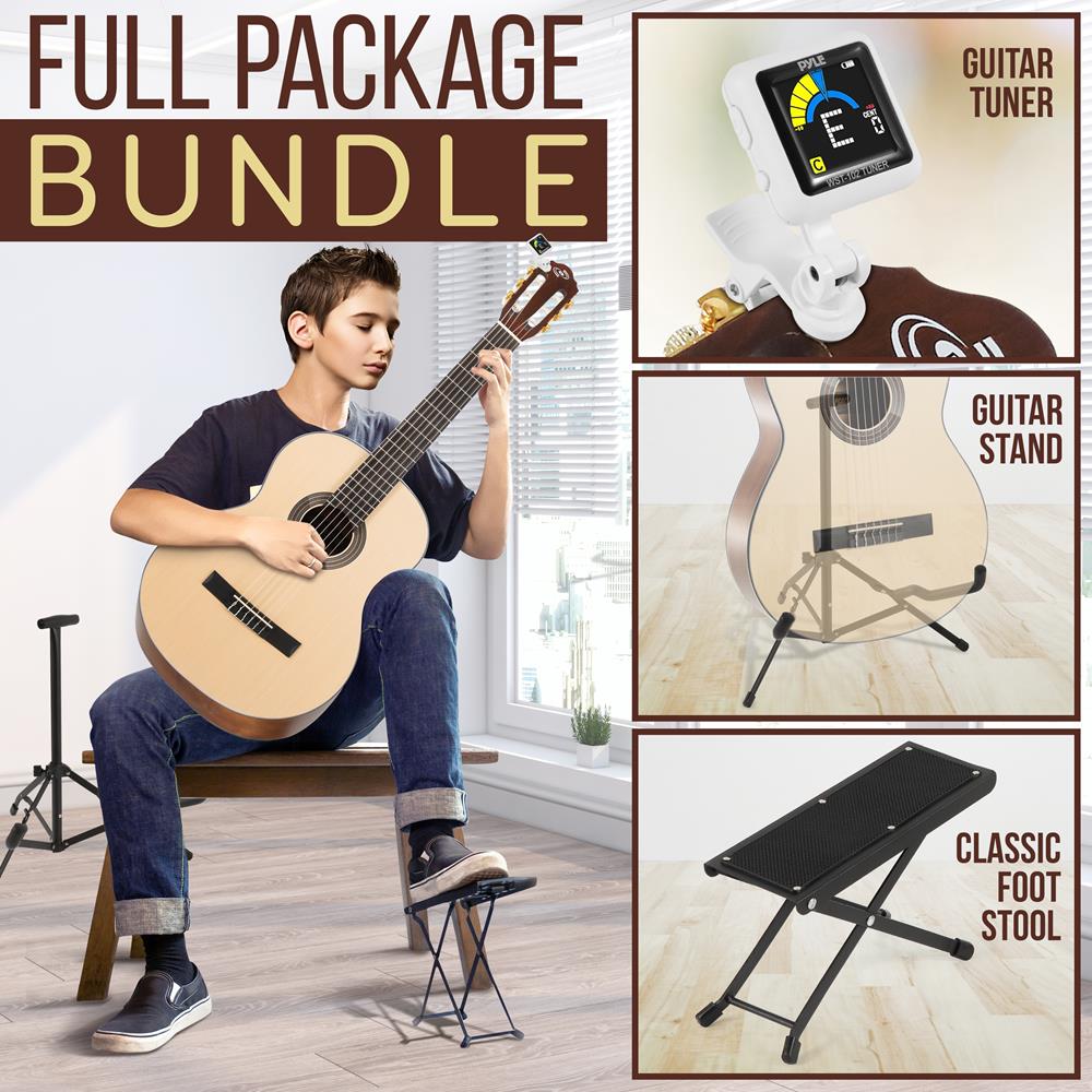- Guitare - Médiators - Accordeur numérique - Sac de transport / rangement pour guitare, épaisseur 3mm - Support de guitare - Repose-pieds Accordeur numérique : - Matériau des cordes : Cordes en nylon