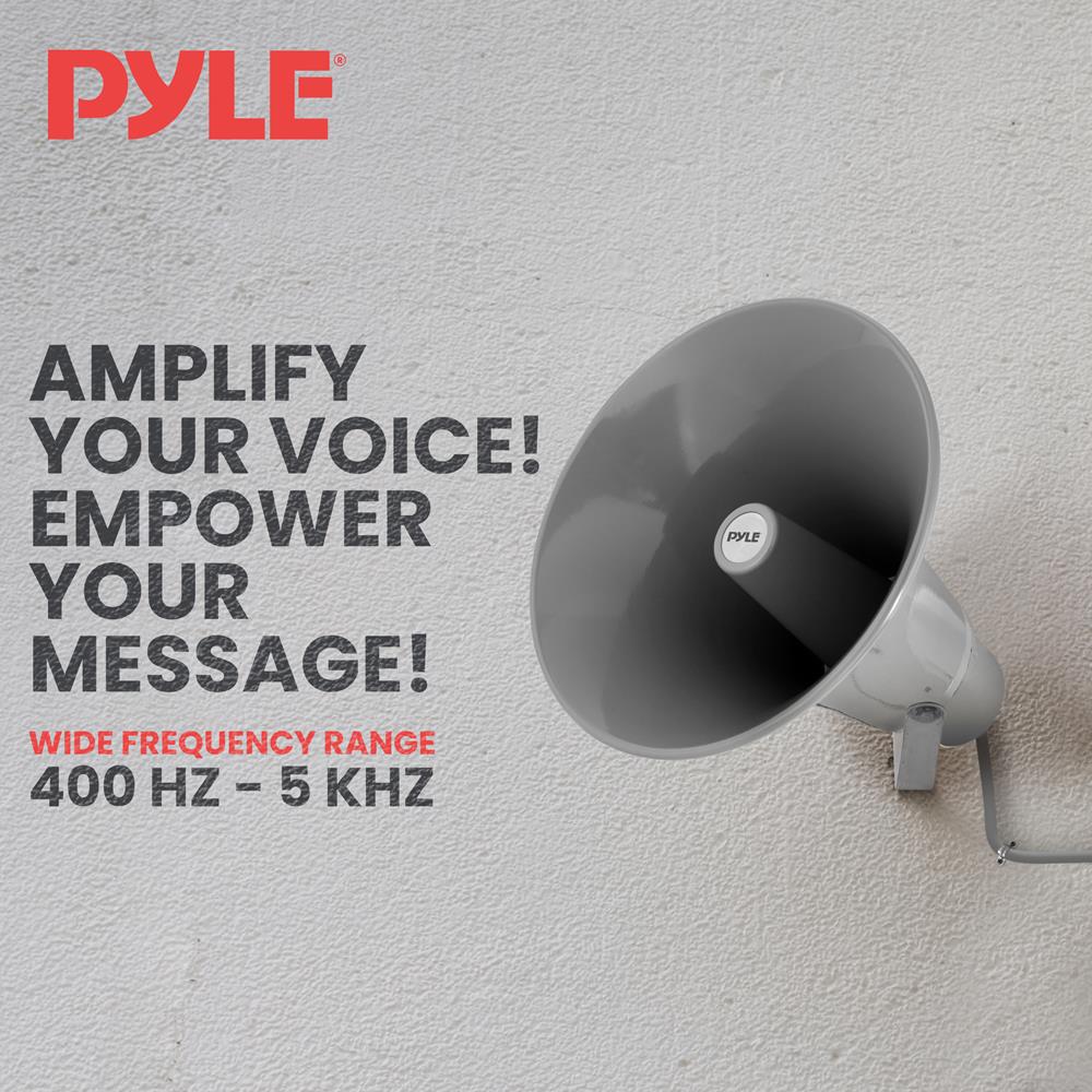 Ce haut-parleur à pavillon de 13,5" pour intérieur/extérieur est idéal pour votre système audio 70 V. Parfait pour les systèmes de sonorisation extérieurs lorsque vous avez besoin que votre son soit entendu au loin. Ce haut-parleur de 50 watts inclut un transformateur 70 V avec prises à 50, 25 et 12,5 watts. Comprend un support de montage et la quincaillerie pour une installation facile. Faites entendre votre voix avec le PHSP131T. Couleur : gris.