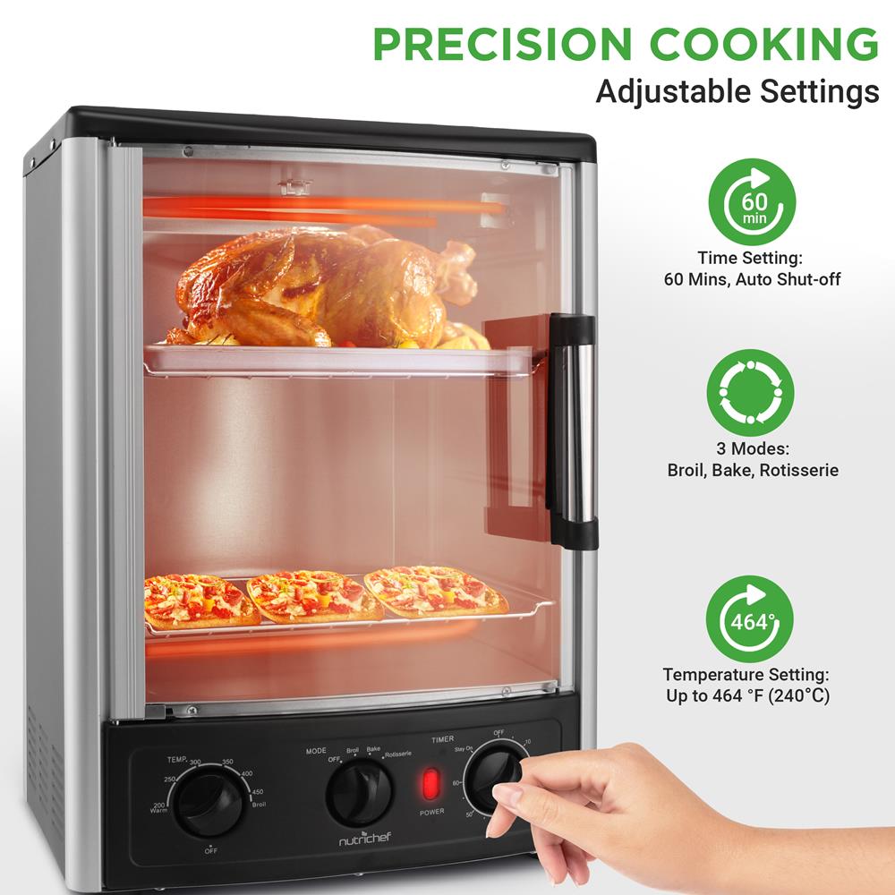 Faites rôtir vos aliments préférés à la rôtissoire pour des résultats sains et savoureux. Le four à rôtissoire vertical de comptoir NutriChef vous offre une préparation des aliments sans tracas. Utilisez la tour à brochettes incluse et insérez votre viande préférée. Le fonctionnement est simple : insérez vos aliments, réglez la minuterie rotative et le four fait le reste ! Gagnez du temps et de l'argent grâce à la préparation simple des aliments avec le four à rôtissoire vertical de comptoir NutriChef.