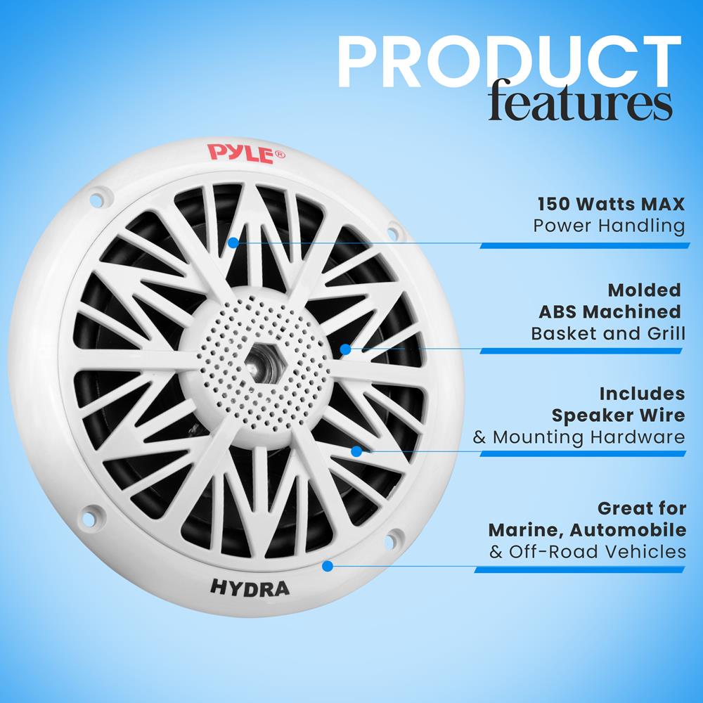 Les enceintes de la série Hydra de Pyle sont étanches et conçues pour être utilisées sur votre bateau, sur le quai, au bord de la piscine ou simplement montées à l'extérieur. Elles sont dotées de grilles en maille inoxydable pour une protection de qualité. Le modèle PLMR52 est une enceinte bidirectionnelle de 150 watts et 5,25'' à large bande, adaptée à une utilisation marine. Cette enceinte est équipée d'une bobine mobile haute température de 1'' pour des médiums et des graves doux, et d'un tweeter à dôme en néodyme de ½'' pour des aigus cristallins. Le panier moulé en plastique ABS garantit un son sans distorsion.