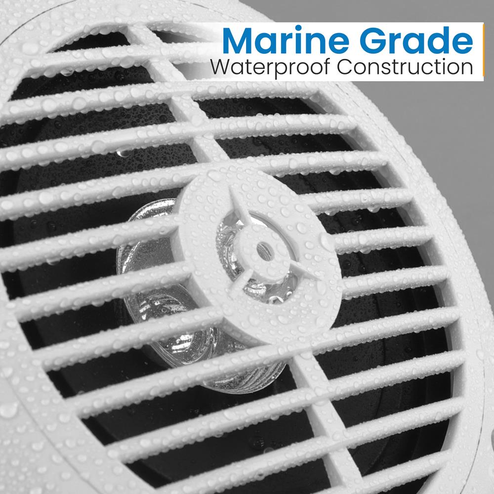 Haut-parleurs à gamme complète à double cône de 6-1/2 pouces entièrement étanches pour une utilisation marine ou pour portière de voiture, cône en polypropylène avec entourage en tissu, grille intégrée moulée, panier en plastique ABS moulé, bobine mobile en aluminium de 1 pouce, aimant de circuit de 20 oz. Réponse en fréquence : 45-16 kHz Impédance : 4 ohms Profondeur d'encastrement : seulement 2,5 pouces Paire complète avec câble et matériel de montage