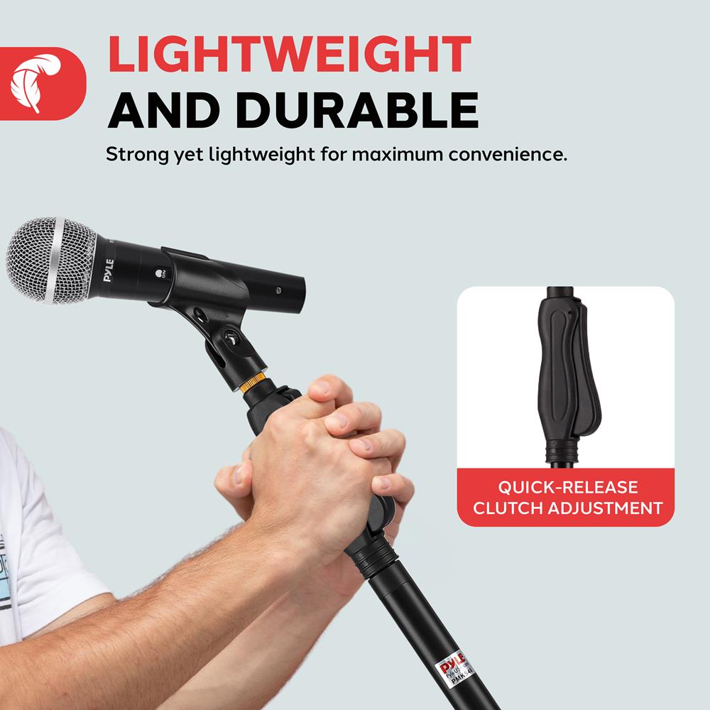 Le support de microphone universel Pyle - support de fixation pour micro, hauteur réglable - construction légère, robuste et fiable - adaptateur et filetage pour microphone standard USA - hauteur réglable : de 27,5 pouces à 57,5 pouces - bouton de verrouillage rapide - pince universelle pour microphone incluse - base ronde compacte - finition noire brillante - parfait pour une utilisation sur scène ou en studio - Caractéristiques techniques : - Filetage adaptateur micro : 5/8 pouce, standard américain - Pince micro universelle : M-6 - Matériau de construction : alliage métallique en acier.