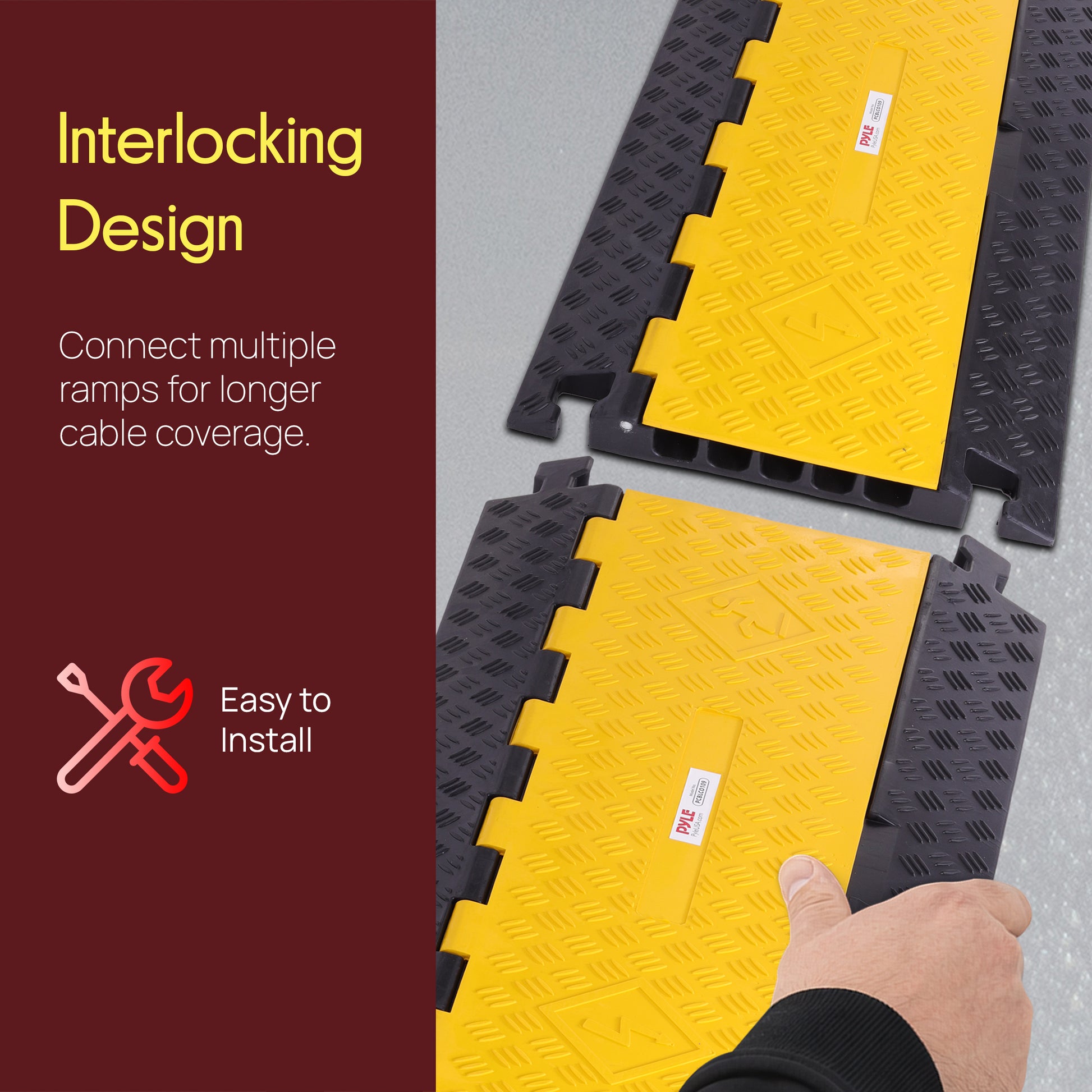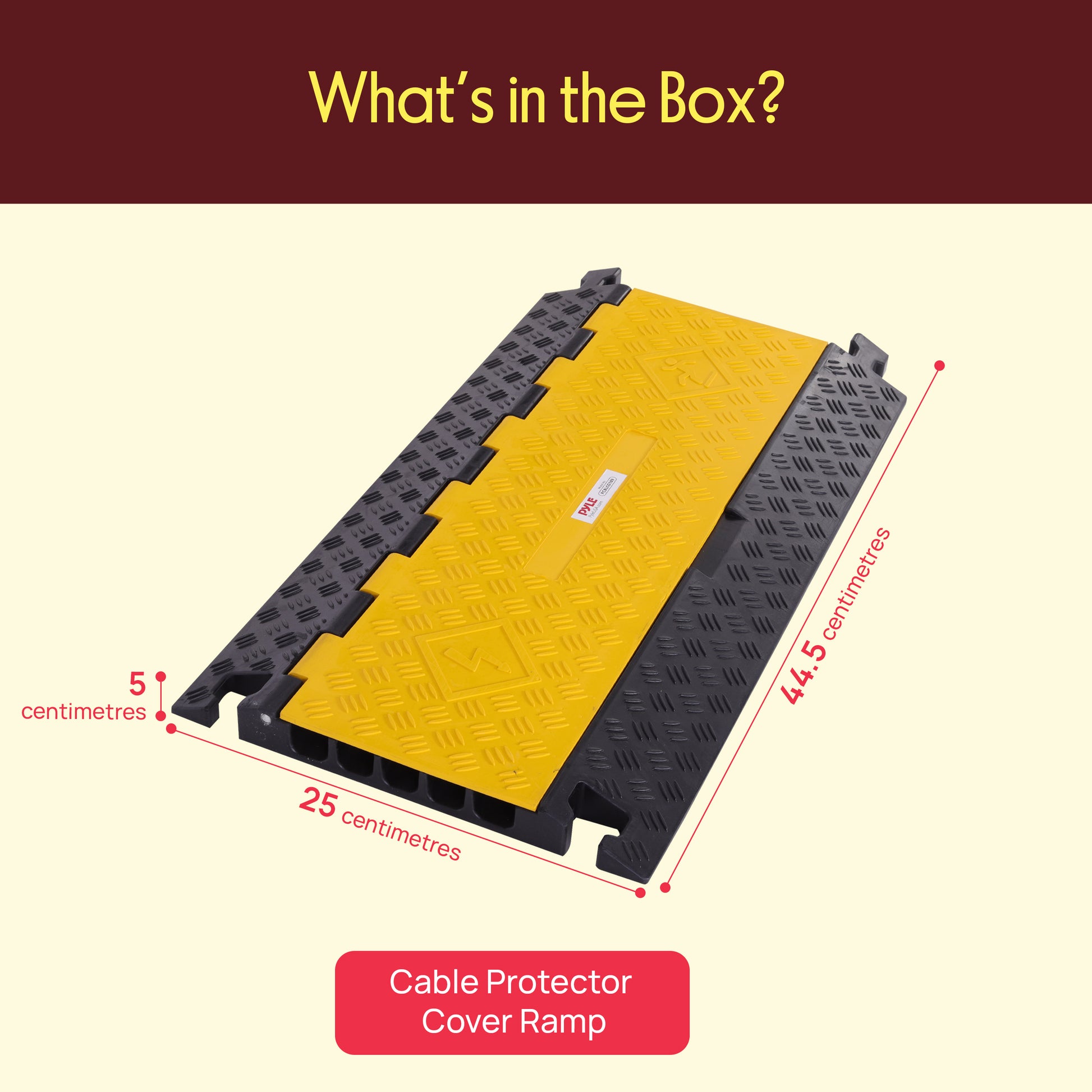 La rampe de protection pour câbles Pyle - Piste de dissimulation de sécurité pour cordons/fils avec couvercle à accès rabattable (modèle extra large à cinq canaux) - Rampe de couverture sans tracas - Camoufle en toute sécurité les câbles, fils, cordons, tuyaux, tubes, conduites, etc. - Construction robuste et durable - Couleur jaune haute visibilité - Conception à cinq canaux - Couvercle à charnière « flip-open » pour un accès facile - Construction étanche de qualité marine - Large rainure pour plusieurs câbles ou cordons - Rainures de plus grande taille pour accueillir des câbles plus gros - Système de connecteurs mâle/femelle à emboîtement - Les connecteurs permettent l’assemblage d’unités supplémentaires/externe - Sécuritaire pour la circulation piétonne et les véhicules légers - Utilisé à la maison, au bureau et en entreprise - Utilisation intérieure/extérieure - Spécifications techniques : - Poids maximal supporté : jusqu’à 33 000 lbs. - Taille d’un canal/rainure (L x H) : 1,4’’ x 1,9’’ (chacun) - Dimensions totales de l’unité (L x l x H) : 31,5’’ x 17,5’’ x 2,0’’.