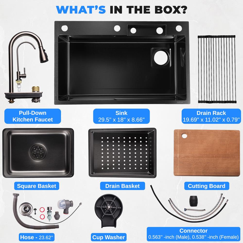 - Dimensions de l'évier (L x l x H) : 29,5'' x 18'' x 8,66'' - pouces