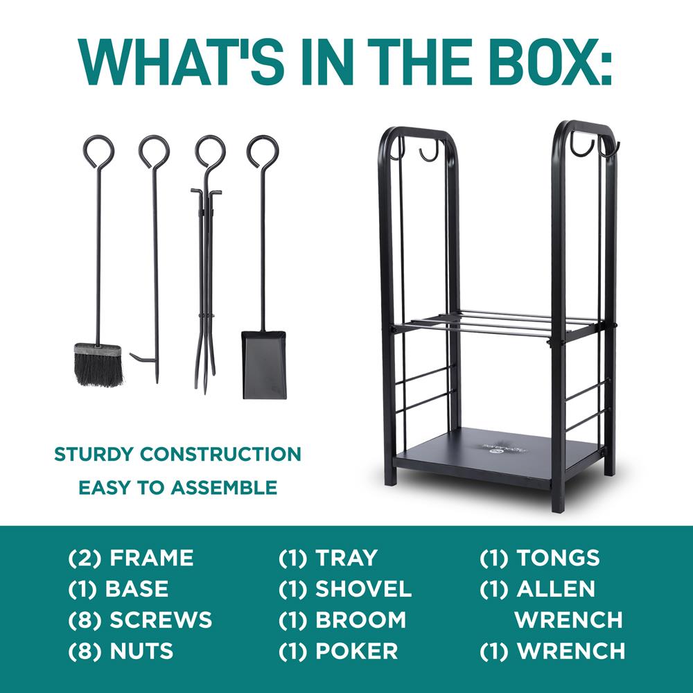 - Fourni avec des poignées ergonomiques, des crochets intégrés et un ensemble complet d'outils comprenant une pelle, une brosse, un tisonnier et une pince pour tous vos besoins liés au bois de chauffage
