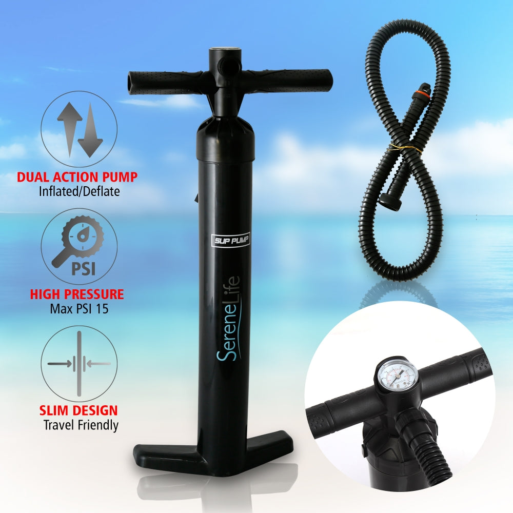 • Use the manual air pump to suck out the remaining air from the board. Connect the pump hose to the air valve and switch the pump mode to deflate. Pump until the board is fully deflated and flat.