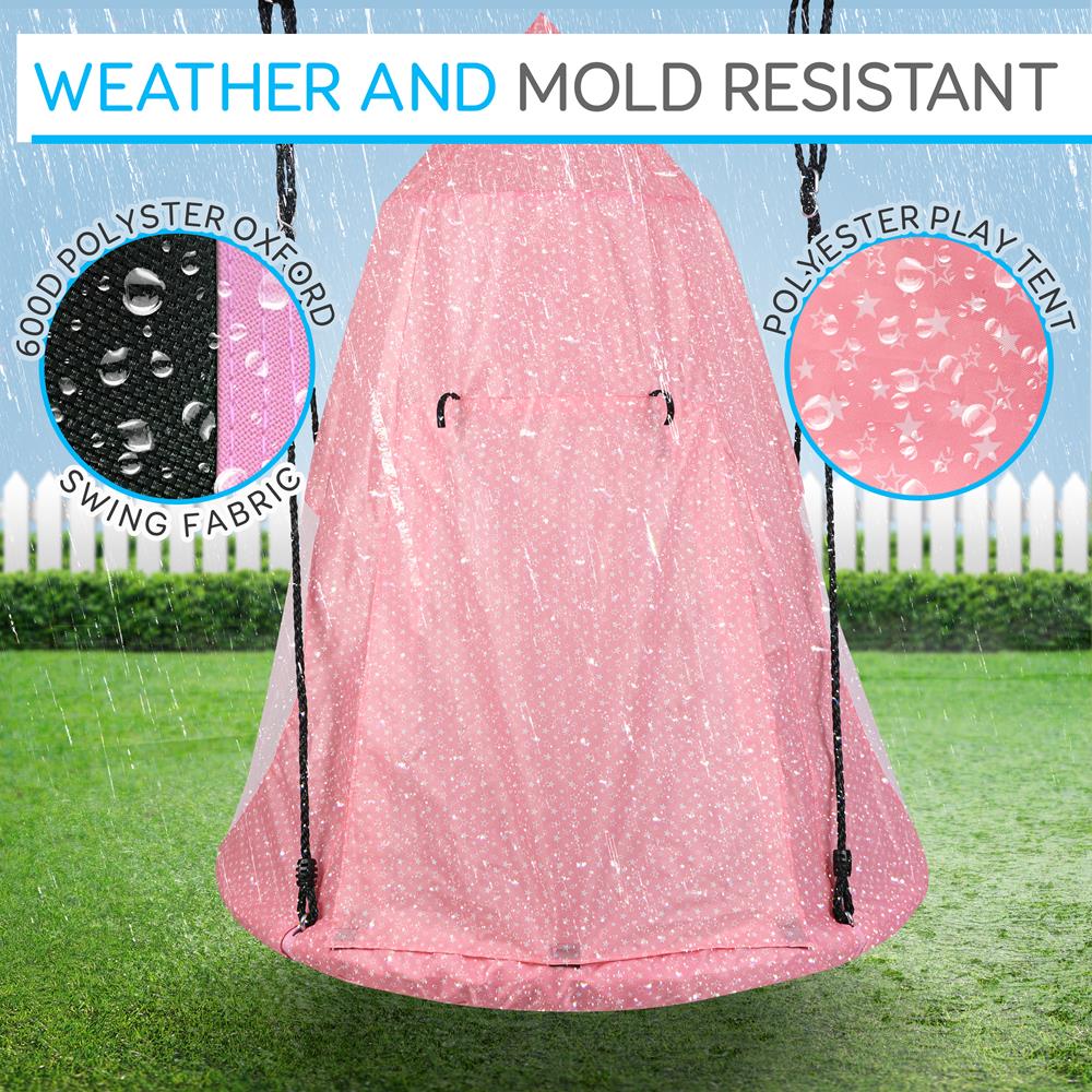 - Siège de balançoire confortable et rembourré de style soucoupe - Comprend une tente de jeu amovible - Hauteur de balançoire réglable - Excellente pour l'installation à la maison et dans le jardin - Facile à assembler pour une installation rapide et une portabilité