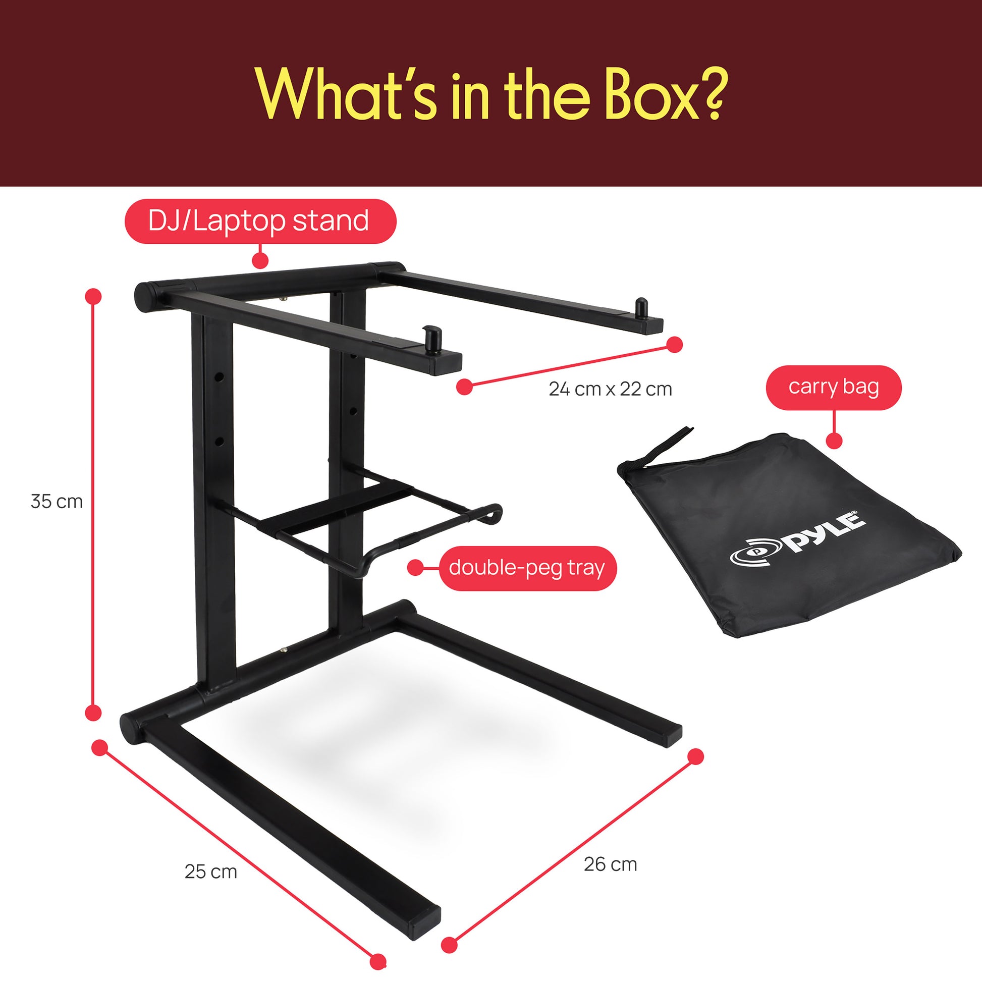 Le support portable universel pliable professionnel pour DJ de Pyle avec plateau accessoire supplémentaire - Ce support maintiendra de manière sûre et fiable tous les formats d’ordinateur portable, iPad et tablettes - Le plateau accessoire pratique accueille une carte son, des disques durs, une petite table de mixage et tout autre appareil - Unité légère et robuste qui se plie à plat pour plus de commodité et de portabilité - L’unité tient dans un sac à dos ou une sacoche de transport incluse - Conçu pour une utilisation en studio à domicile ou en déplacement - Le plateau à double cheville maintient l’ordinateur portable en sécurité dans les environnements exigeants - Il suffit de glisser le plateau accessoire en tige d’acier robuste et il est prêt à l’emploi - Instructions de pliage incluses - Poids de l’unité : 1,5 kg - Dimensions pliées : 26 x 25 x 3 cm - Dimensions dépliées : 26 x 25 x 35 cm - Dimensions de l’étagère pour ordinateur portable : 24,5 x 21,5 cm.