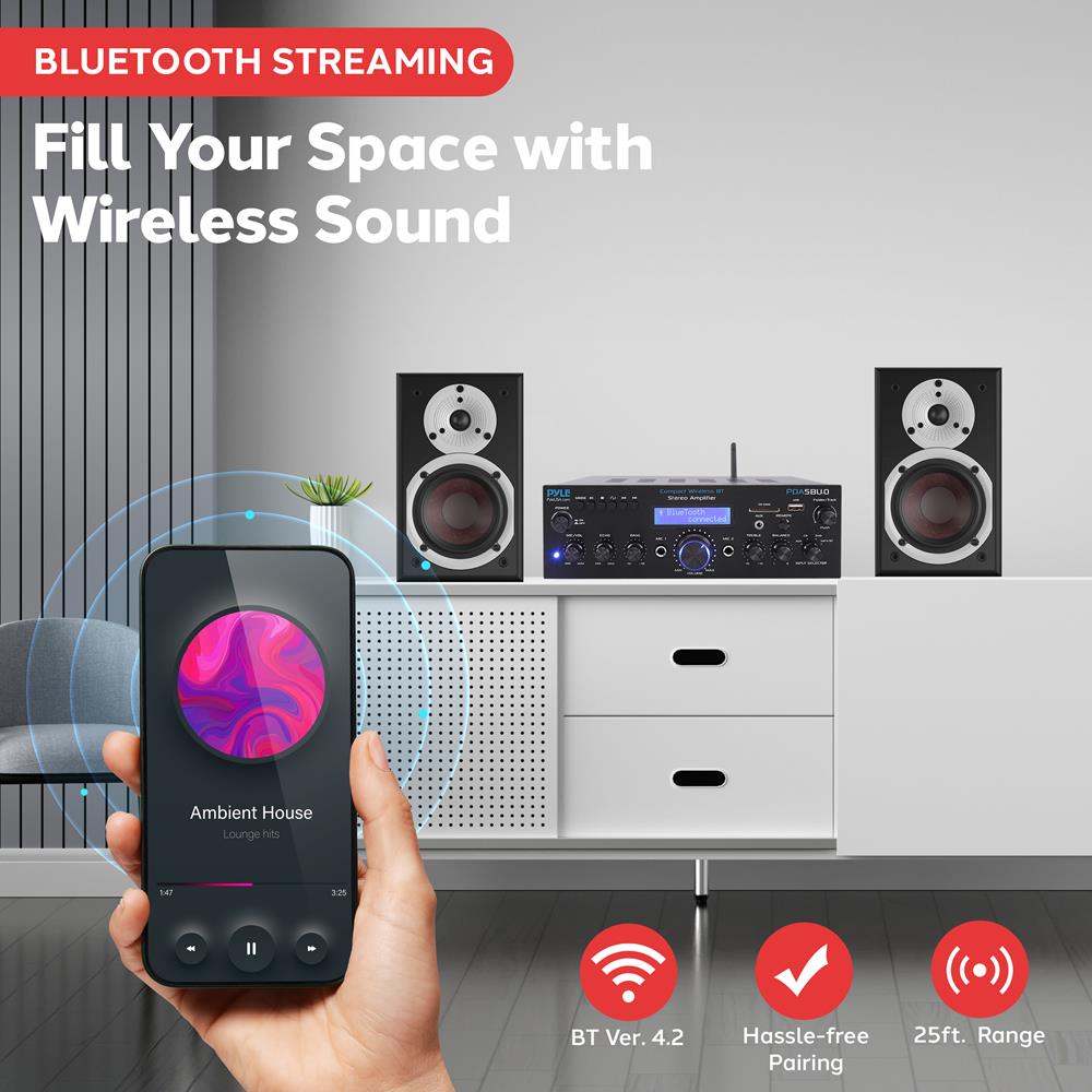 The Pyle Compact Stereo Amplifier Receiver System is the perfect solution for all of your home audio needs! Add powerful home theater style audio performance to your desktop that utilizes next generation surface-mount technology (SMT) -- designed to perform and deliver clear, accurate sound. It's loaded with plenty of sound playback features including Bluetooth wireless audio streaming, USB flash and SD memory card readers with MP3 digital audio file support, FM radio, along with an Aux (3.5mm) input jack to directly connect & stream audio from external devices. Connection interface includes dual 1/4’’ inch microphone jacks, RCA (L/R) connectors, banana plugs and the USB input also doubles as a device charge port. Gain convenient audio control with the front panel control center while the digital LCD screen provides ID3 tag readout info for music track title display. Enjoyed versatile high-powered sound performance with the Pyle Mini Home Theater Amplifier Audio Receiver System.