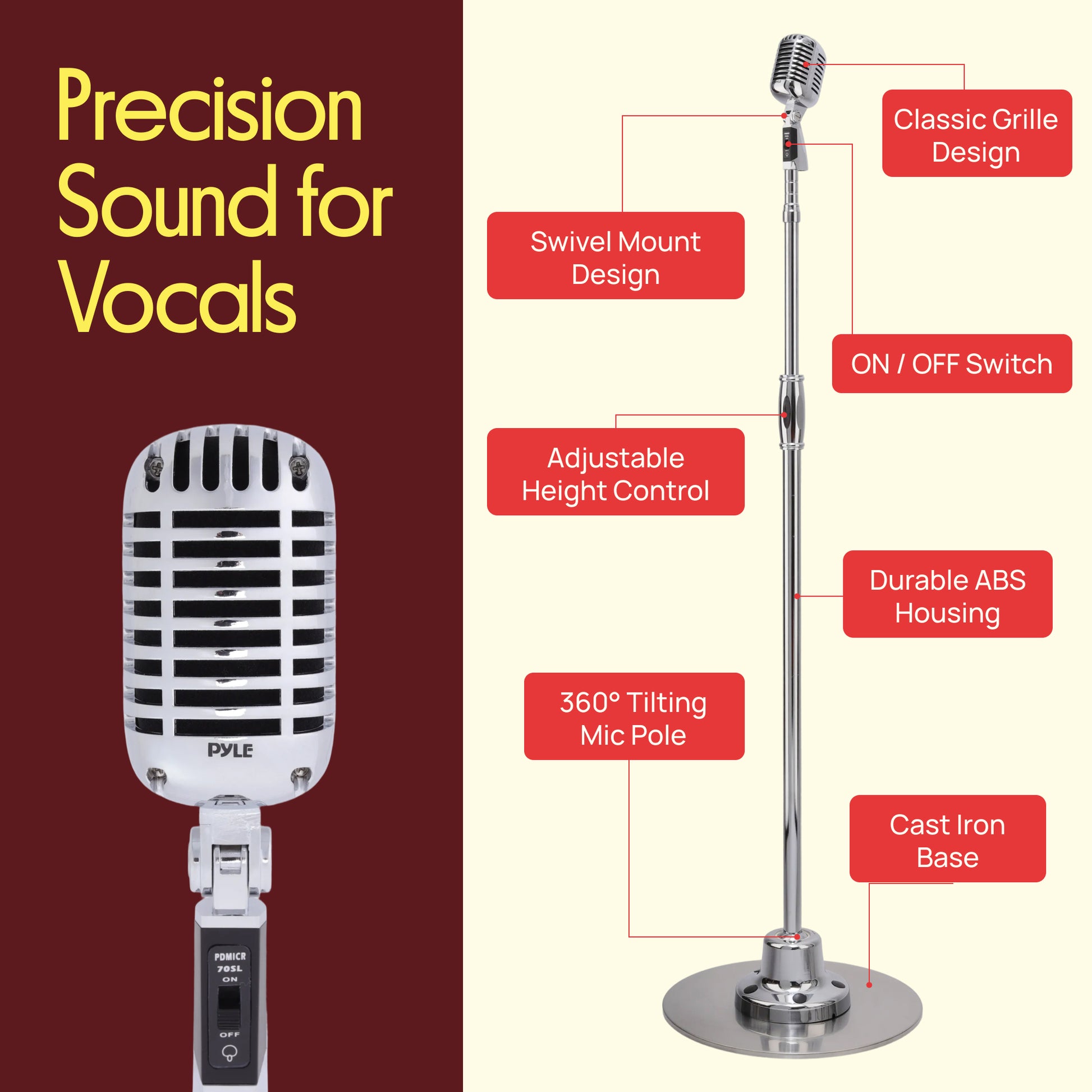 The Pyle Classic Retro Vintage Style Microphone & Swing Stand Silver Style - Classic Retro-Style Performance Microphone + Stand - Enjoy Tomorrows Sound Performance with Classic & Iconic Style - Studio and Stage-Tested Design - High-Gloss Silver Style Polished Finish - Base Pivot Joint: Adjustable & Tilting Mic Pole Stand - Mic Pole Automatically Resets to Original Position After Moving - Quick & Easy Height Adjustment - Simple Screw-Type Control Knob - Perfect for On-Stage and In-Studio Use - Rugged Floor Stand Base Plate - Lightweight & Maneuverable Microphone Pole - Includes XLR to 1/4 Cable 16.5 Ft. - Detachable Microphone - Microphone ON/OFF Switch - Connector Type: XLR (3-Pin).