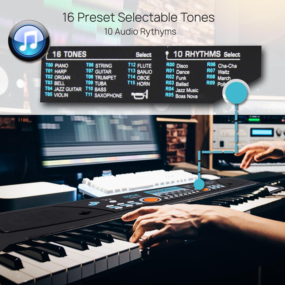 - Multiple Preset Selectable Keyboard Sound, Tone & Rhythm Styles