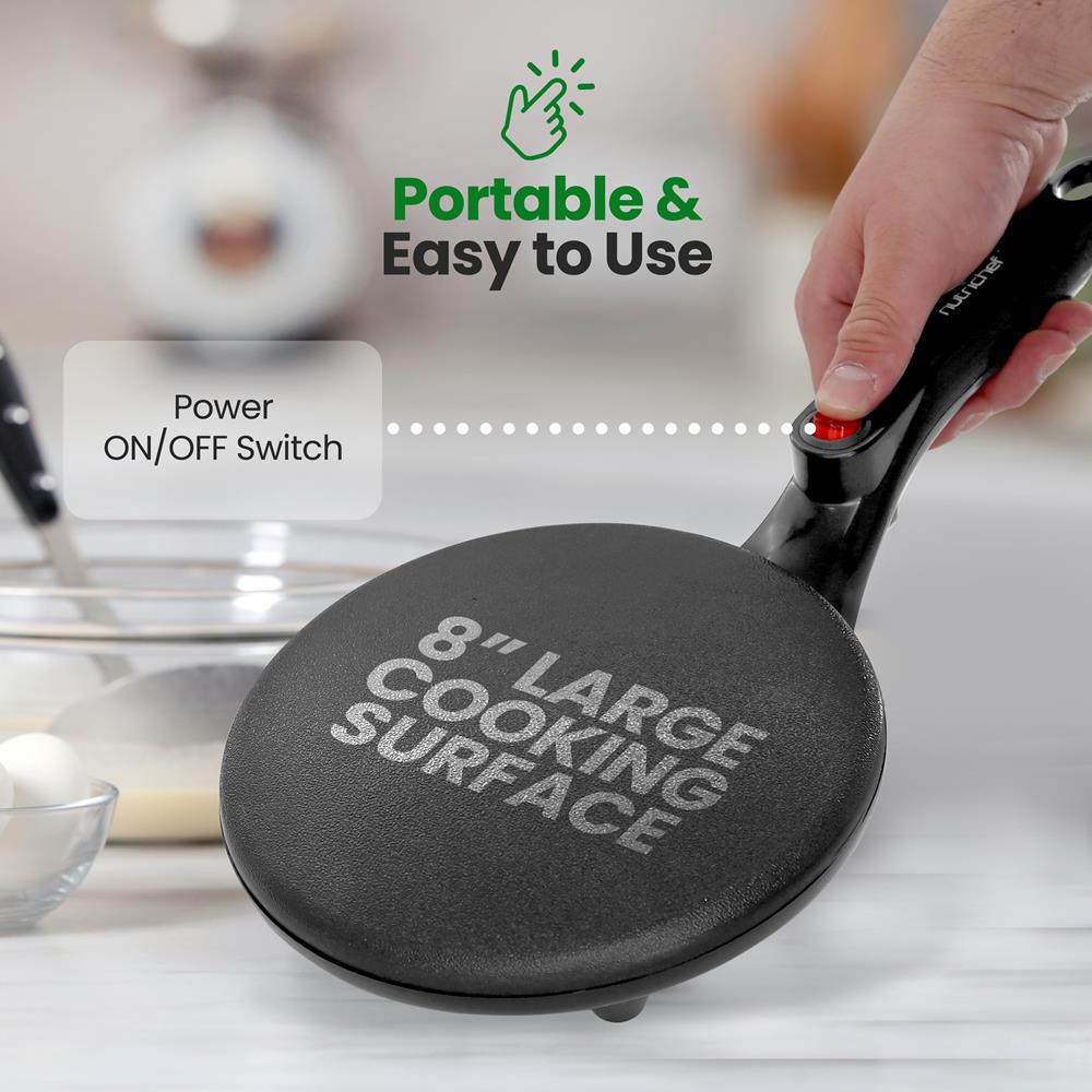 The NutriChef Compact Crepe Maker features an easy-serve, pan-style griddle hot plate. Countertop griddle design allows for quick and convenient food prep with simple electric plug-in operation. The non-stick cooking surface houses a high-powered heating element and cool-touch handle provides safe food handling to any kitchen table or counter. Prepare all of your favorite breakfast meals including eggs, waffles and crepes -- at a blazing fast pace! Breeze through the morning rush thanks to the hassle-free power control switch and stain-resistant, easy-to-clean design. Enjoy compact and convenient kitchen style with the NutriChef Electric Crepe Griddle Hot Plate.