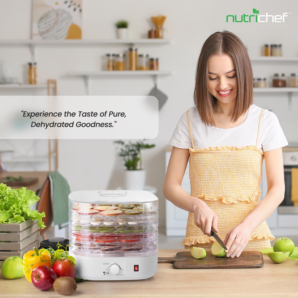 Simply insert your food into the trays and hit the switch to activate a new and healthier level of food preparation. The NutriChef Kitchen Dehydrator effectively works to remove moisture, drying your food and reducing spoilage. The compact tabletop size and multi-level trays allow for enhanced air-flow, dehydrating food for prolonged shelf-life & preservation. Your food will last longer and the removal of moisture content is far more beneficial than canning or freezing. Dehydration with NutriChef retains up to 97% of the food's nutritional value and is scientifically tested to make your food last longer -- and best of all, it still tastes great! Once dried, your food will retain their original vitamins, minerals and flavor! Prepare foods like meat, fish, poultry, fruits, vegetables and more! Save time, save money and save valuable cabinet space since the dehydration process shrinks your food, making it great for food storage or stocking up for the winter. It works great with a wide variety of food groups and is perfect for preparing healthy, oil-free veggie chips for the kids -- or hardy beef jerky for dad. Reduce spoilage and enjoy enhanced food preservation with the NutriChef Food Dehydrator.