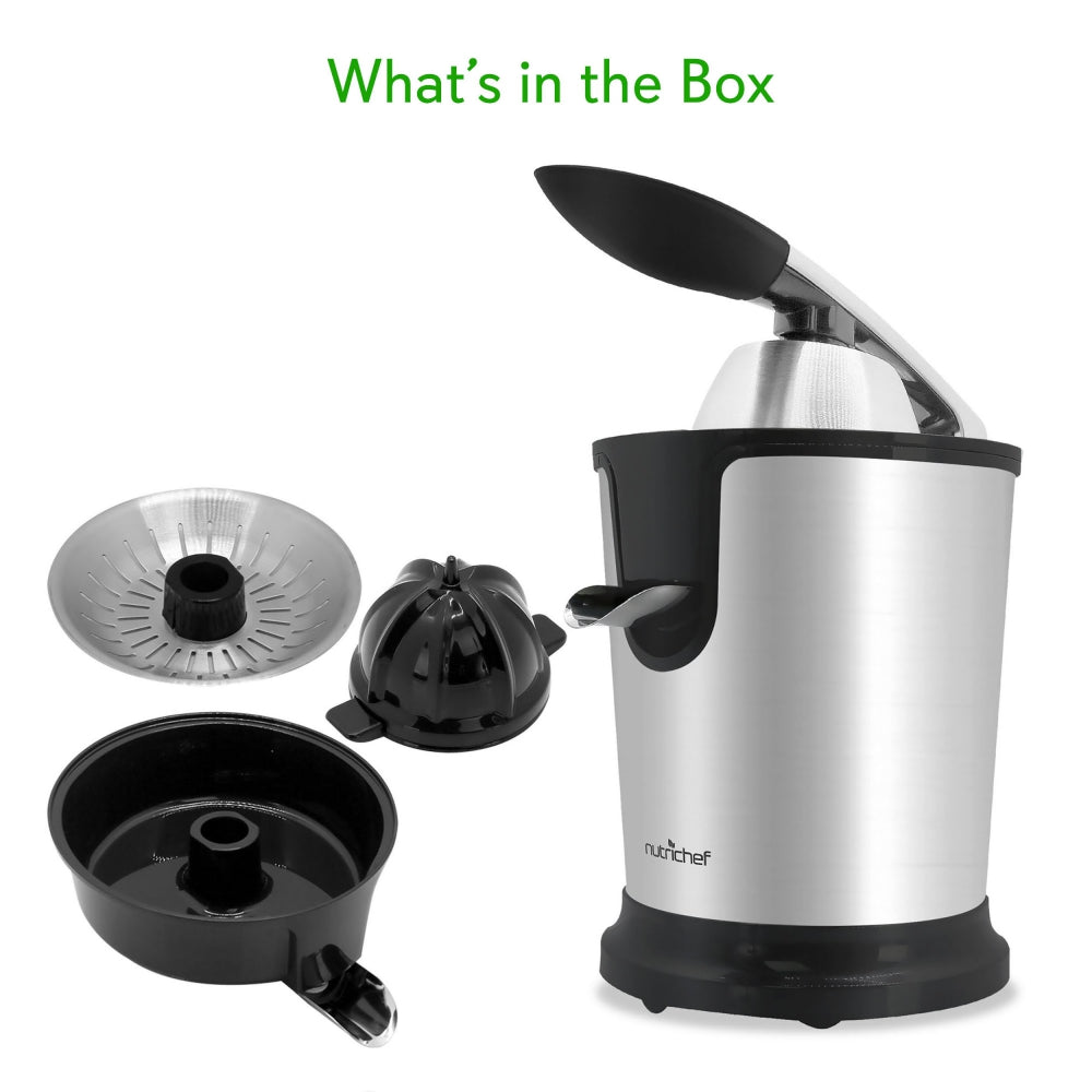 The NutriChef Electric Juice Press - Orange Juicer Citrus Squeezer - Fill Your Glass with Freshly Squeezed Juice! - Automatic Spiral Fruit Juicer - Simple Electric Plug-in Operation - Used for Oranges, Lemons, Limes, Pomegranates, Grapefruits - Convenient Pressing Handle - Ridged Auger Cone for Maximum Juice Extraction - Juices Quickly & Flows Through the Spout Tip - Integrated Filter Catches Large Pulp & Seeds - Detachable Parts for Easy Cleaning - Sleek Stainless Steel & Stain-Resistant Housing - Convenient Kitchen Table & Countertop Design - Technical Specs: - High-Powered Juicing Motor: 160 Watt - Construction Material: Stainless Steel, Engineered ABS - Power Cable Length: 2.8’ ft. - Power Supply: 120V.