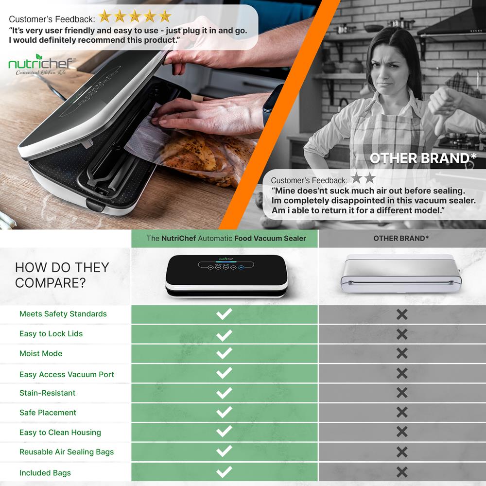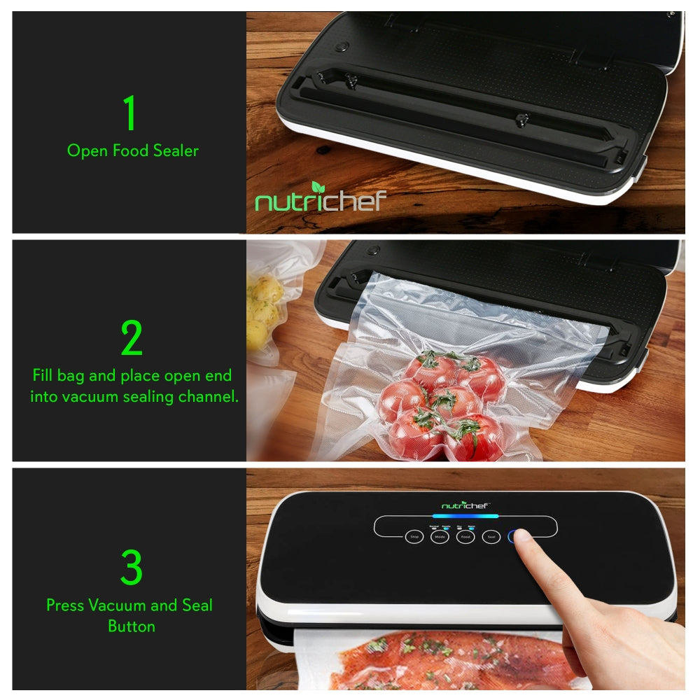 The NutriChef Automatic Food Vacuum Sealer - Electric Air Sealing Preserver System (Black) - Automatic Vacuum Air Sealing Made Easy - Save Time & Money with Smart Meal Prep - Lab Tested to Effectively Increase Food Shelf Life - Hassle-Free Operation & Simple Electric Plug-in Design - Selectable Sealing Modes: Seals ‘Dry’ and ‘Moist’ Food - Used for Dieting by Pre-Determining Food Portions - Creates Strong, Air-Tight Bags via Heat-Sealing - Re-Usable & Waterproof Air-Sealing Bags - High-Power Suction Element - Top Panel Control Center - Soft Touch Digital Button Controls - Stain-Resistant & Easy-to-Clean Housing - Safe Placement on Any Kitchen Table/Countertop - LED Indicator Lights - *Can Also be Used for Preserving/Waterproofing Non-Food Items - What’s in the Box.