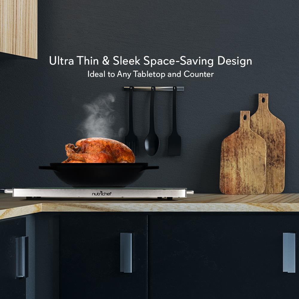 The NutriChef Electronic Warming Tray provides convenient and hassle-free food prep ability. The tabletop design resembles a buffet warming hot plate -- that features sleek stainless steel construction and non-stick, heat-resistant tempered glass. The high-powered heating element heats quickly and the ultra-thin space saving design is safe for placement on any table or counter. Use the warming tray with baking sheets, casserole dishes or just about any other heat-resistant cookware in your kitchen. Heat your food up to 203°F while the cool-touch carry handles allow for safe food transport. Enjoy energy efficient and convenient food prep ability with the NutriChef Electronic Warming Tray.