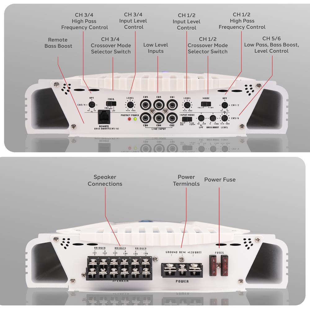 Just bought a PLMRA830BT I need a setup wiring diagram for 6 @100w & 1 250w sub