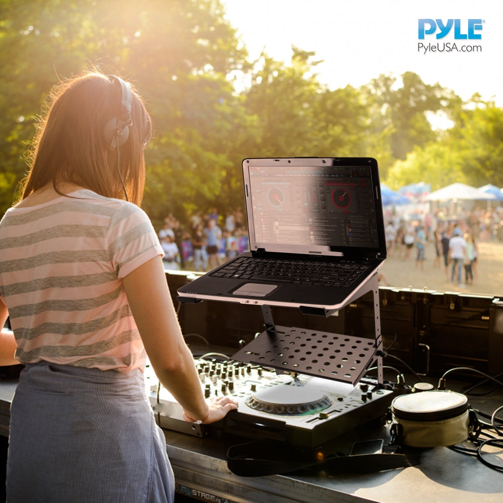 Check out the PLPTS26, an awesome laptop stand from Pyle Pro that's perfect for DJing. It places your laptop at an angle for easy access while you drop your beats. Plus, it has a variable height adjustment for your convenience. Holds up to 8 lbs. Also compatible with CD players, controllers, EFX machines, and lighting controllers.