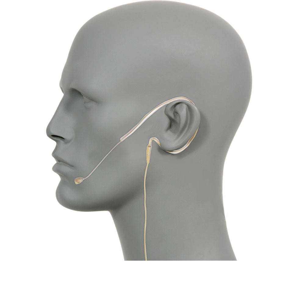 Hi. What transmitter works with these mics and will they work for a stage play production? Do they come in skin tone colors?