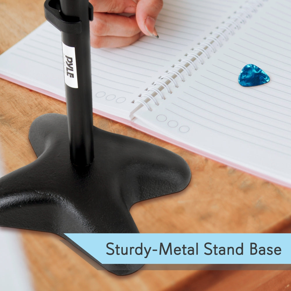 The Pyle Desktop Microphone Stand - Height Adjustable & Boom Extending Desk/Tabletop Mic Mount - Lightweight & Compact Mic Stand Style - Universal Handheld Microphone Compatibility - Convenient Desktop / Tabletop Mount Design - Height Adjustable Tightening Clamp - Boom-Style Arm Extension Adjustable - Sturdy, Metal Stand Base - Disassembles for Easy Transport& Storage - Perfect for Home, Office or Studio Use - *Some Assembly Required - What’s in the Box: - Adjustable Mount Arm - Microphone Clip - Base - Technical Specs: - Microphone Clip U.S. Standard: M-6 - Universal Screw-On Threading: Standard 5/8'' -inch - Construction Materials: SteelAlloy Base + Mounting Pole.