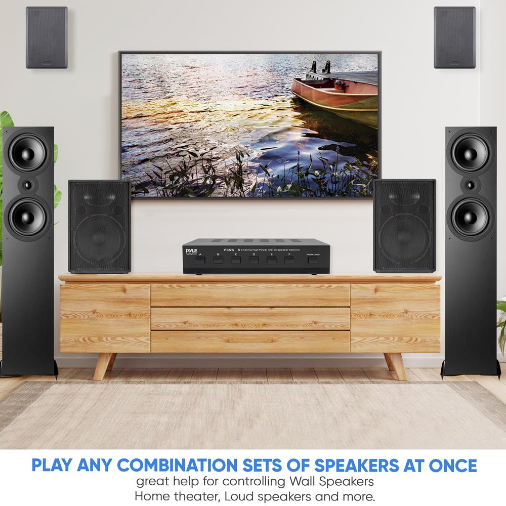 This speaker selector box allows you to play audio to up to six different stereo speaker sets. It easily handles up to 100 watts per channel with speaker systems that have a minimum impedance of 8 ohms. Each input has an on/off switch. Protection circuitry keeps it running smoothly and prevents speaker burn-out. Accepts speaker wires up to 14 gauge.