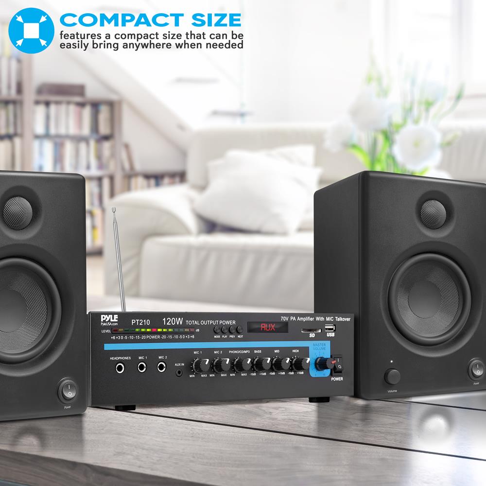 This 120-watt microphone amplifier takes your voice to the next level! The amplifier's wide frequency response makes it suitable for amplifying music or vocal program material. It can be used for live bands, office paging systems, public announcements, or a variety of other installations. It’s got two front ¼” inputs for mics, each with its own independent volume control and talkover. Plus, there’s two stereo RCA inputs on the back – including one that takes low level phono input from a turntable. The 3-band EQ (100 Hz, 1 kHz, 8 kHz) lets you tweak the sound to your exact requirements. This amp is compatible with 70 V PA systems too. An unswitched outlet on the back means you’ll never be looking for an outlet. Runs on 110 and 220 V.