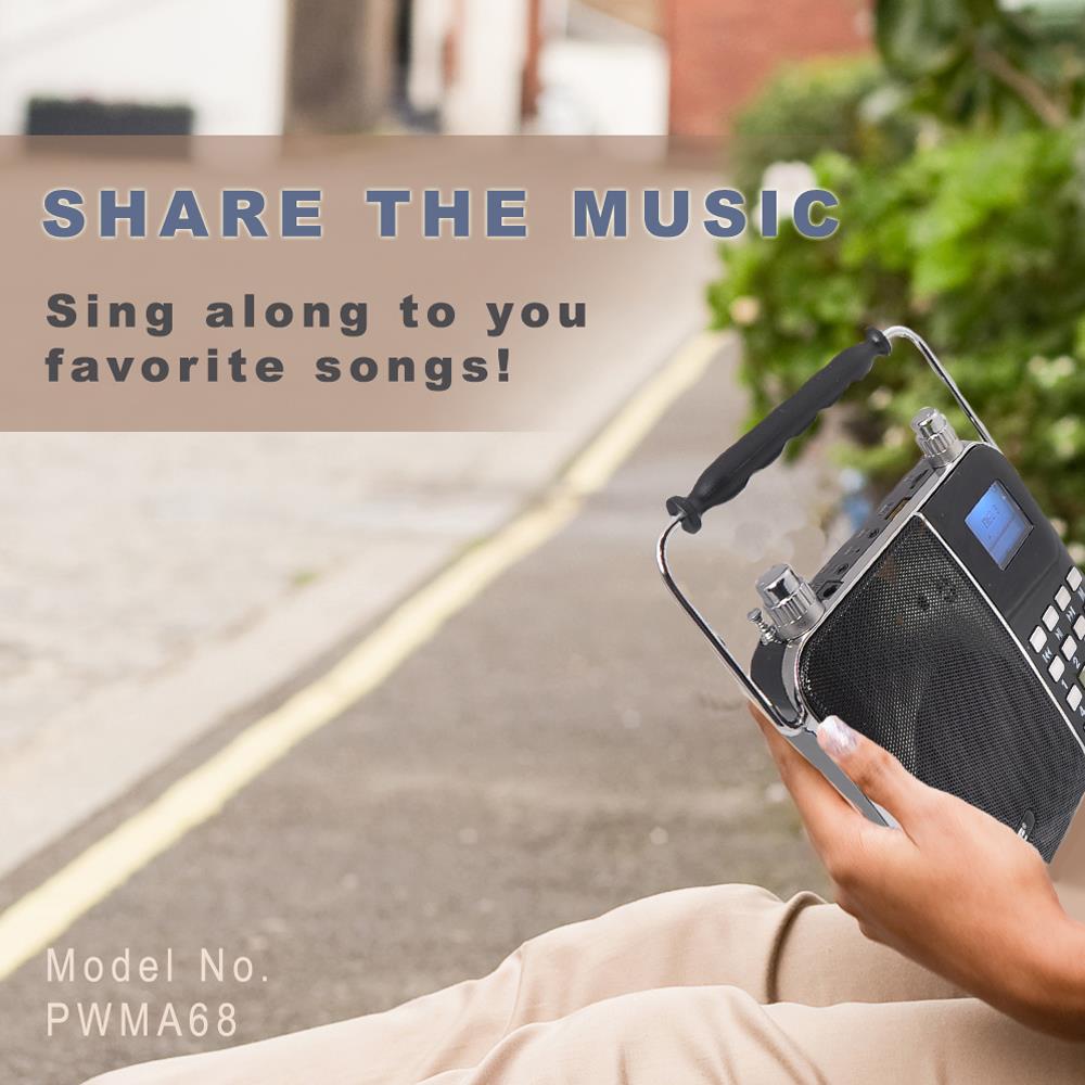Enjoy convenient, compact & wireless sound projection with the Pyle Sing Along Portable Karaoke Speaker System. This PA speaker features an included headset microphone to get your message heard loud and clear! It's compact and super portable thanks to the built-in rechargeable battery -- so you can play your music anywhere! Sing along to your favorite songs with the unique display that shows you the lyrics to your song. Use your computer to download or create lyric files, and the system's screen reads-out the words. You can also tune in to your favorite FM radio station, connect digital media files via USB flash port or Micro SD memory card reader, or you can even use the Aux (3.5mm) input jack to stream audio from other external devices. MP3 digital audio file compatibility allows you to stream music files right from your computer's media library. Use it like a megaphone to project your voice on the go -- or put on a living room talent show performance! Project your voice, or your music, with the Pyle PWMA68 Sing Along Portable Karaoke Speaker System.