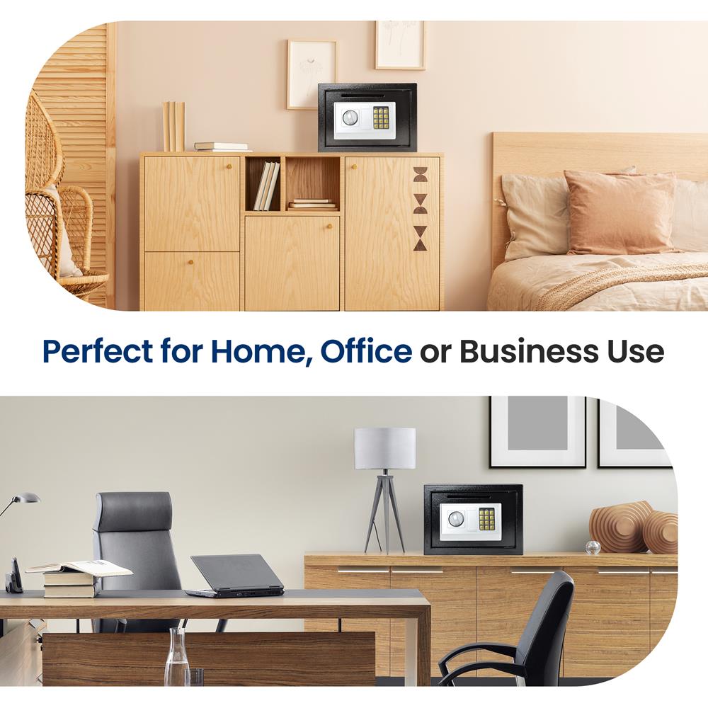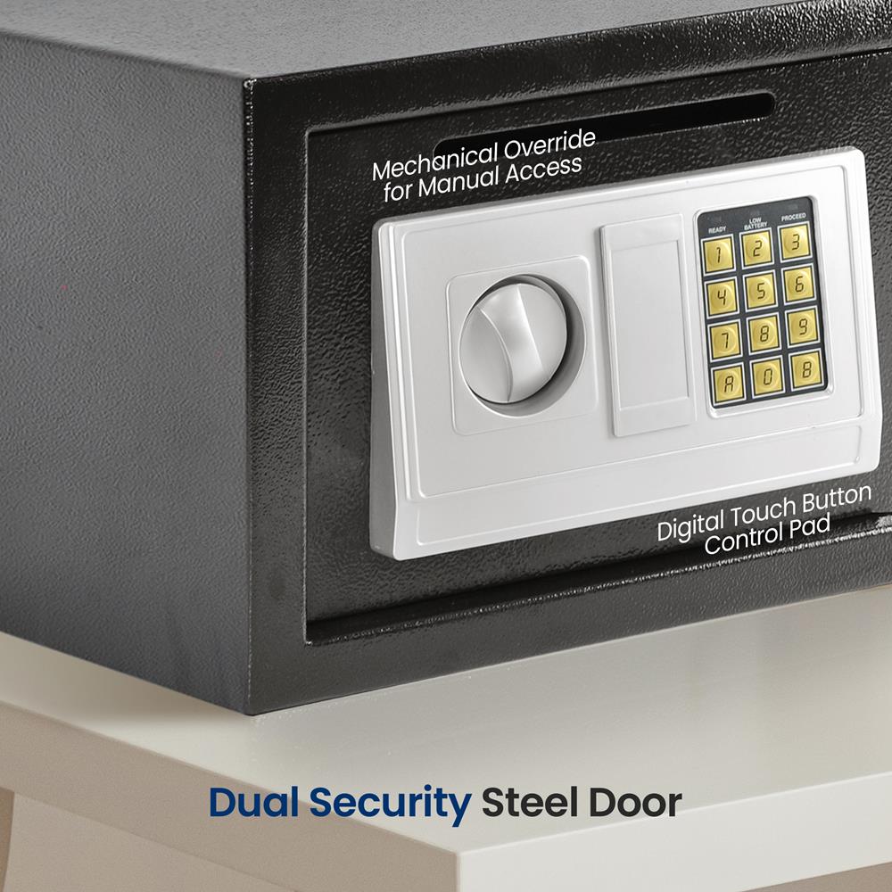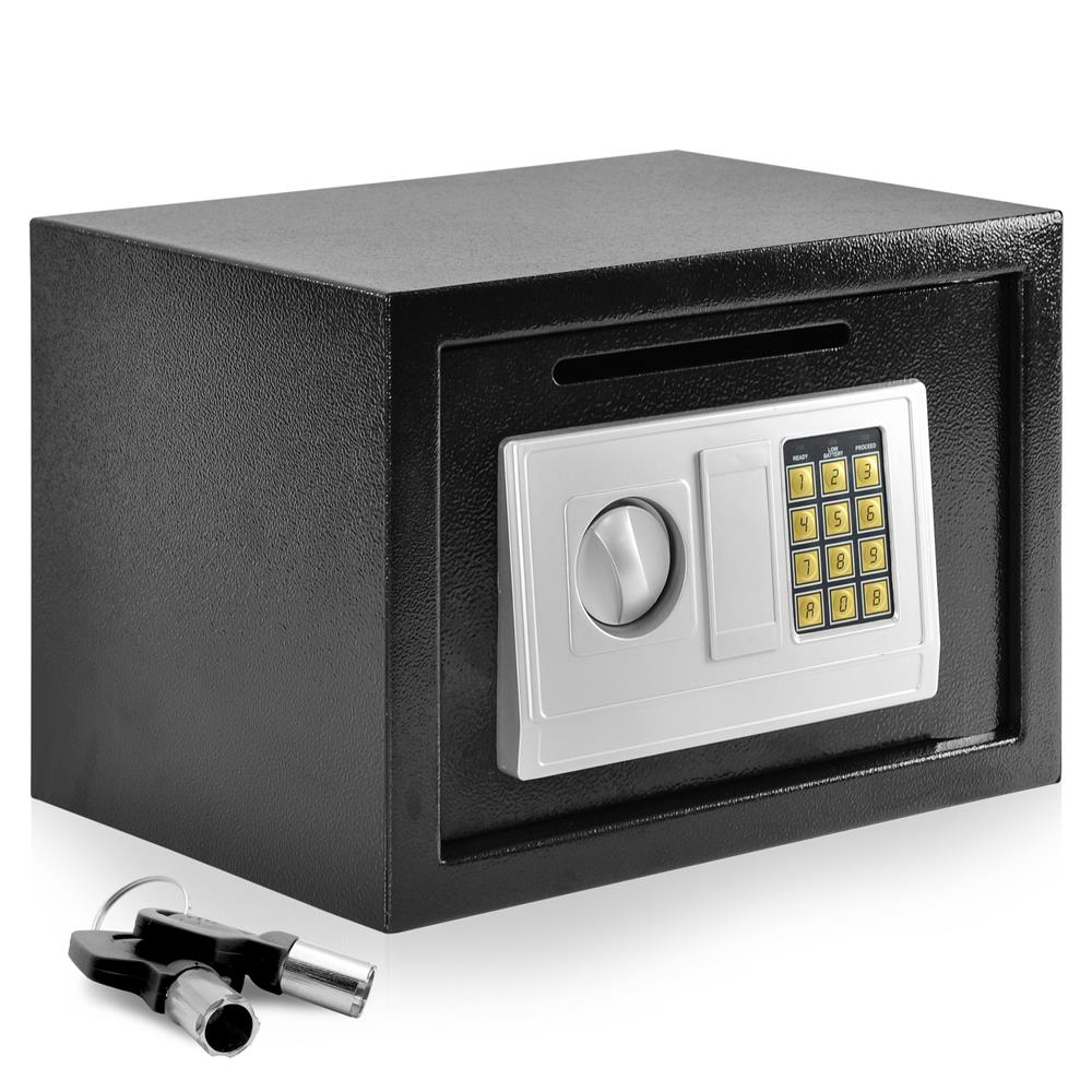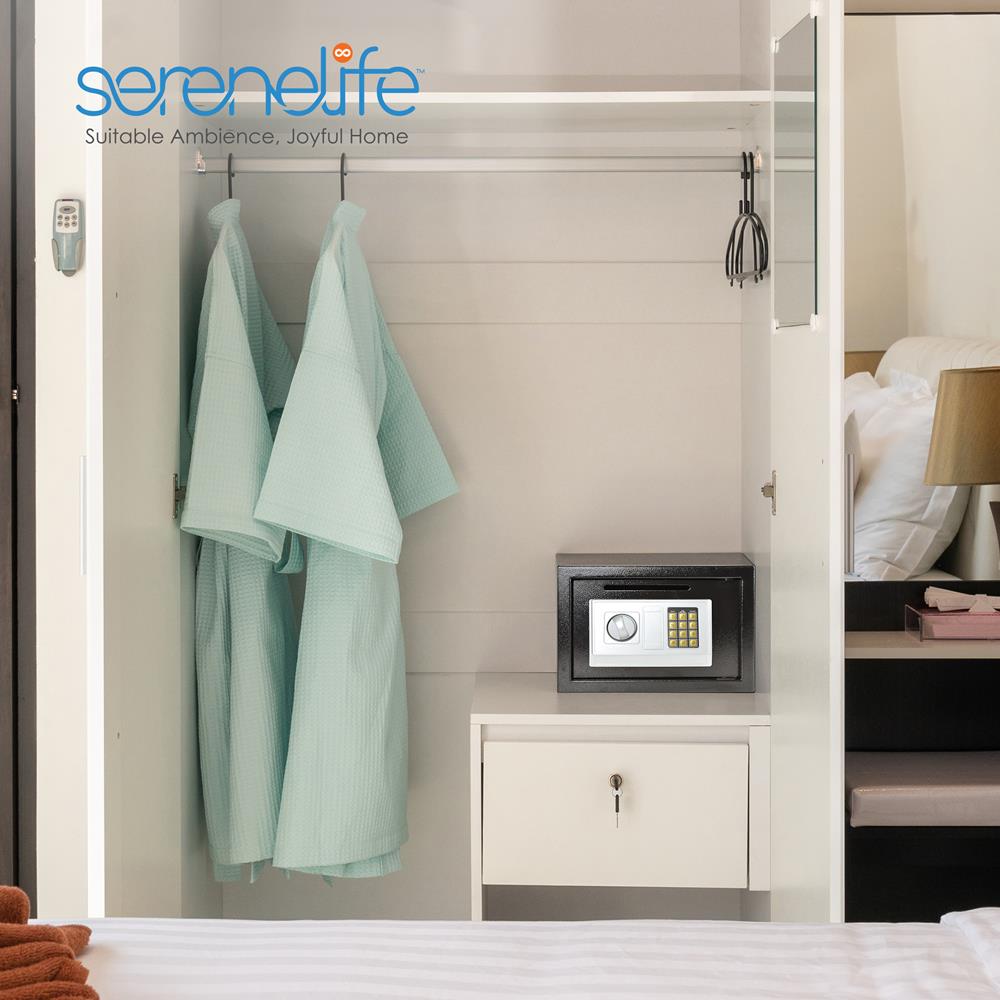 The SereneLife Safe Box will keep your valuables secure & protected. Use the front panel digital button pad to easily control the electronic locking system. Enjoy hassle-free operation and quick access to your belongings after entering your customizable key code. The safe box also allows for manual access with (2) included keys. Additional features include rugged steel alloy construction, dual security steel door locking bolts, corrosion & stain-resistant powder coat finish, pre-drilled anchor holes for permanent mounting in a convenient location, along with a convenient slot ‘drop-in’ cutout window for depositing documents or bills without the need of unlocking. Store your valuables and keep them protected with the SereneLife Electronic Safe Box.