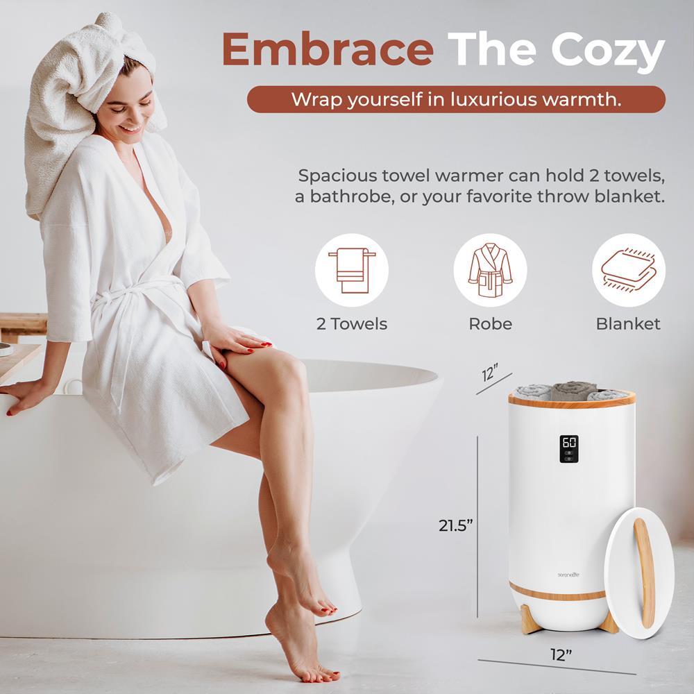 - CAPACITY OF A TOWEL WARMER: Comfier towel warmer with wide cavity measures 12" x 12" x 21.5" -inches and can contain two big bath towels or one personal throw blanket, as well as wardrobes. The hot towel bucket may be used by the entire family